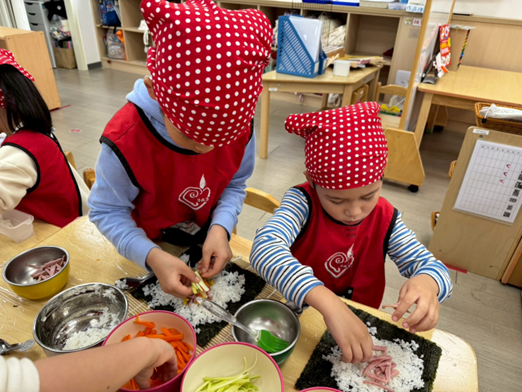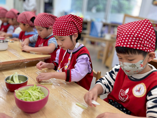 帶領繪本引導幼兒認識壽司的製作方式與常見食材,並讓幼兒實際參與食材準備,從中了解食材處裡的過程及食材對身體的益處,接著透過動手製作壽司,練習鋪、放、捲、壓等動作,從中培養幼兒小肌肉精細動作操作與手眼協調能力,同時體驗料理的樂趣。
