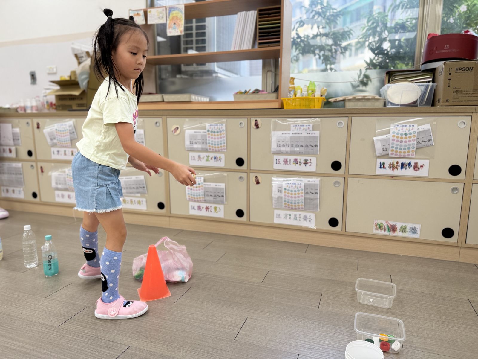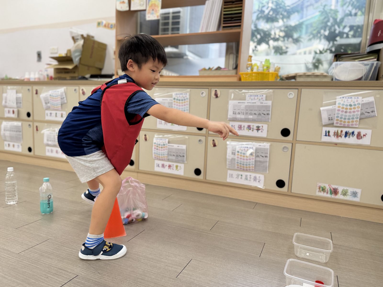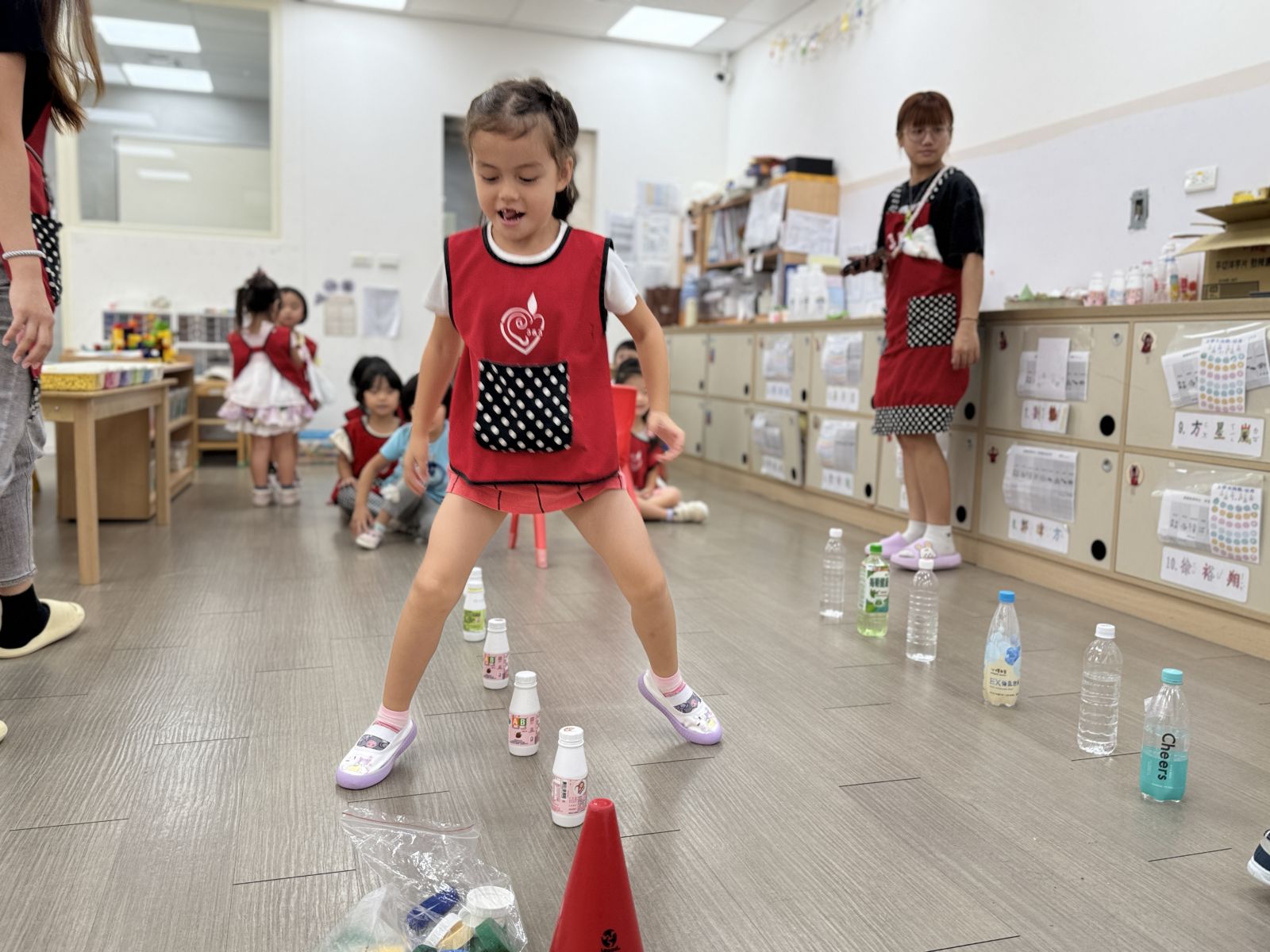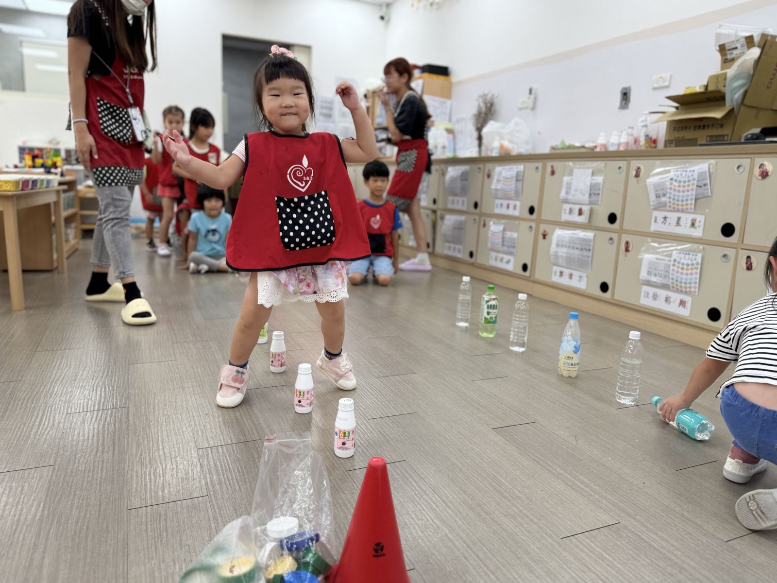 幼兒運用優酪乳罐當作三角錐練習雙腳跳躍,並練習丟擲瓶蓋至盒子中訓練幼兒手部大肌肉能力。