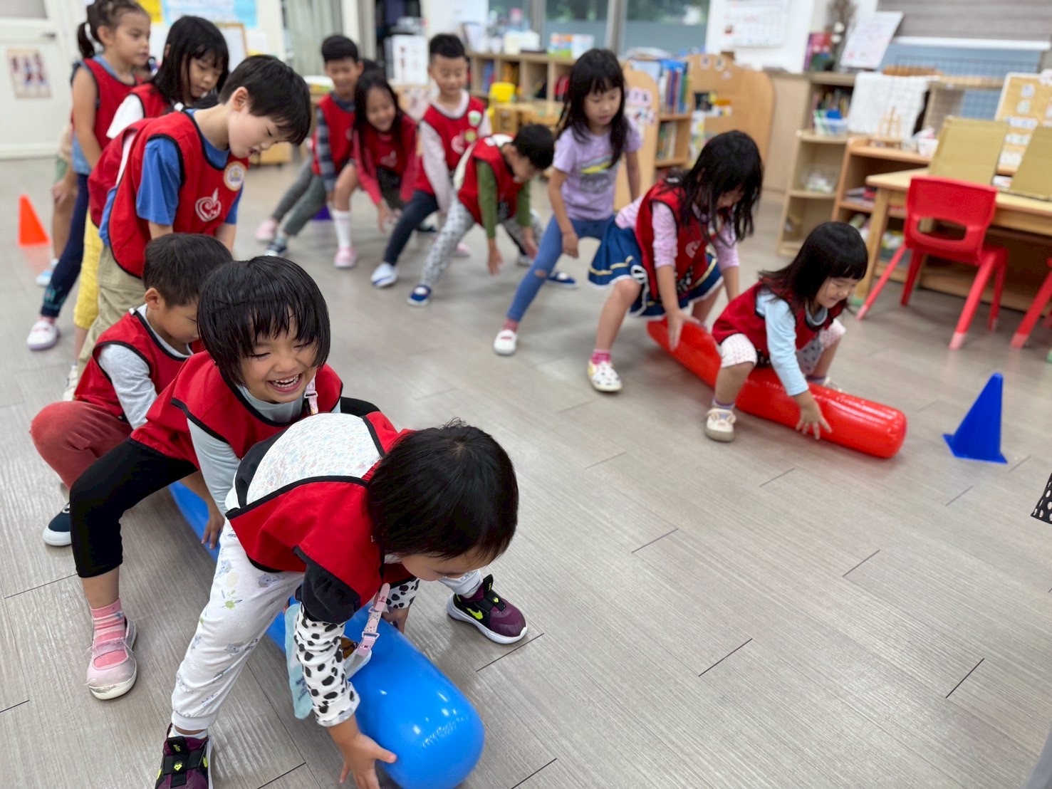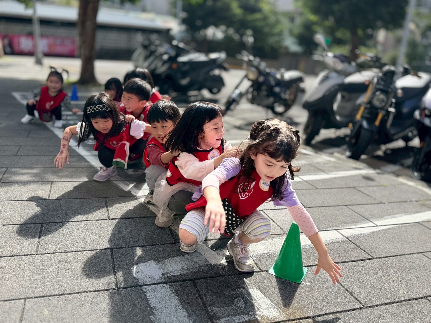 幼兒一邊蹲走一邊觸碰三角錐,過程中也要留意與他人間的安全距離,培養幼兒肌耐力及專注力