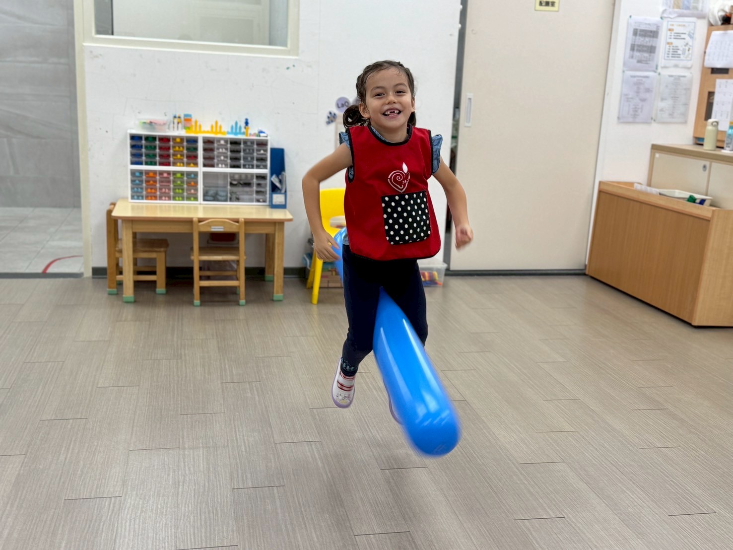 幼兒透過空氣棒進行傳接遊戲從中培養團隊合作能力,也運用空氣棒增加跳躍遊戲的趣味性。