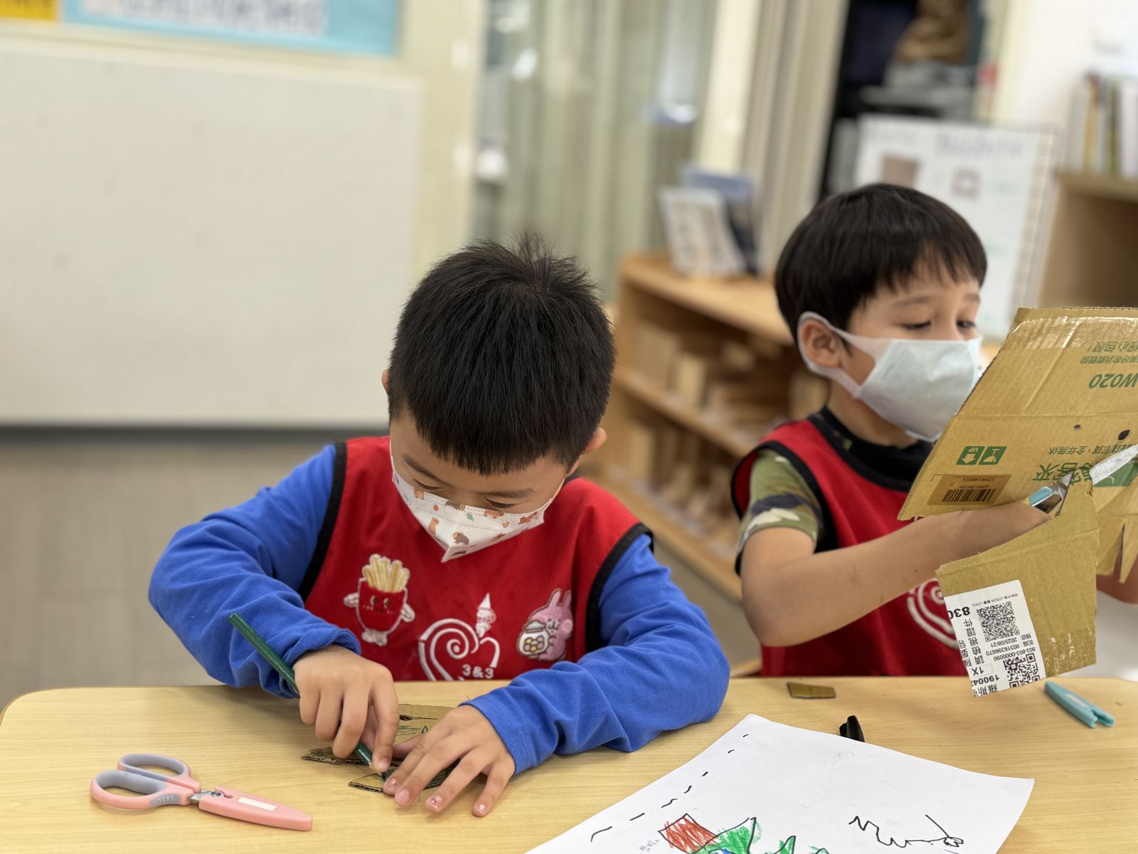 在課程活動中,老師邀請親子運用回收素材製作可玩/可動的回收 玩具,或是回收模型,並邀請幼兒將作品帶至學校與大家分享,並在分享及試玩過後,老師邀請幼兒以小組活動的方式將大家喜歡的回收玩具進行改良,也讓諾貝爾組的幼兒透過彼此與家人製作玩具的經驗一同討論製作出創新的回收玩具。