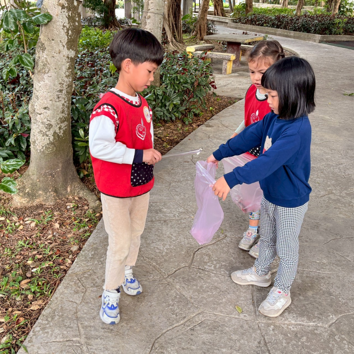 在主題課程尾聲,老師帶領幼兒一同回顧這學期的課程經驗,並讓幼兒將在課程中學習到的環保意識推廣出去,除了透由高峰活動的推廣外,老師也帶領幼兒一同走入社區透由撿拾社區中的垃圾,實際做出環保的行動,將環保意識持續推廣出去。