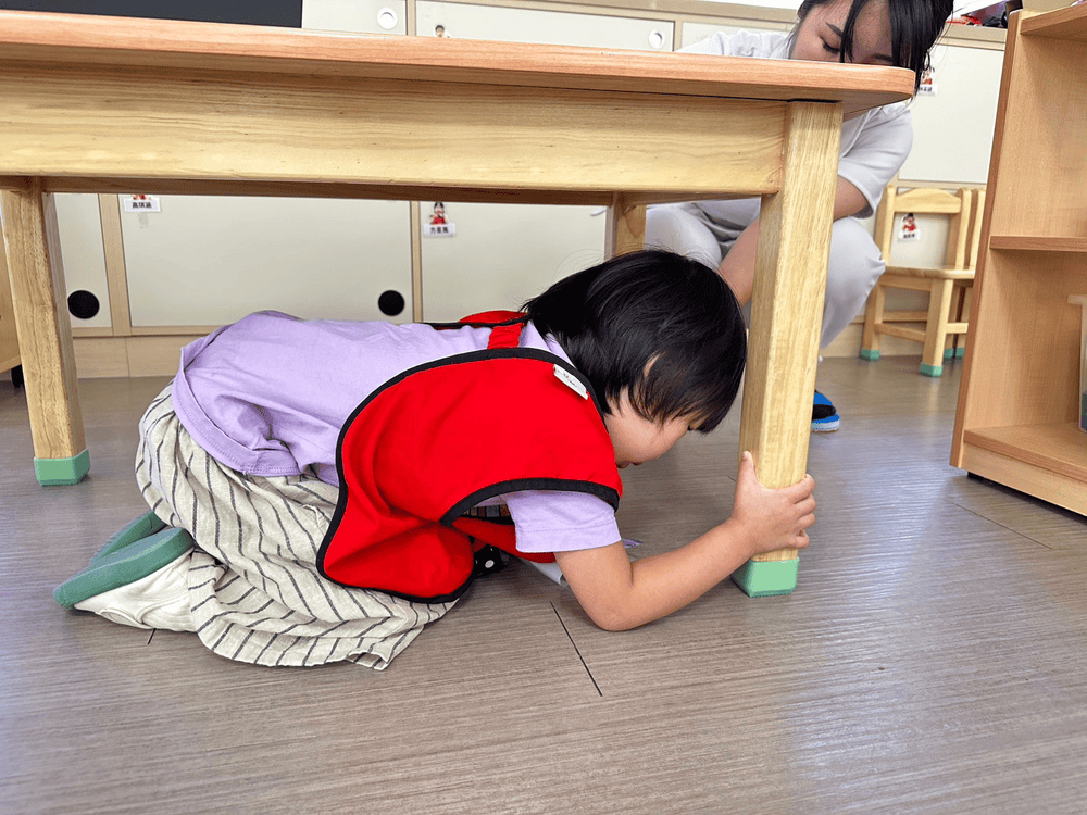 透過避難疏散演練、與幼兒一起演練「趴下、掩護、穩住」動作,加深幼兒對於防震的印象。