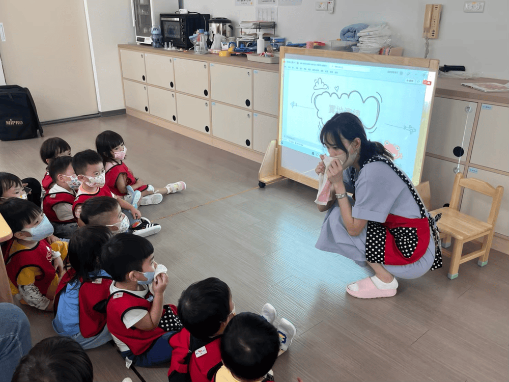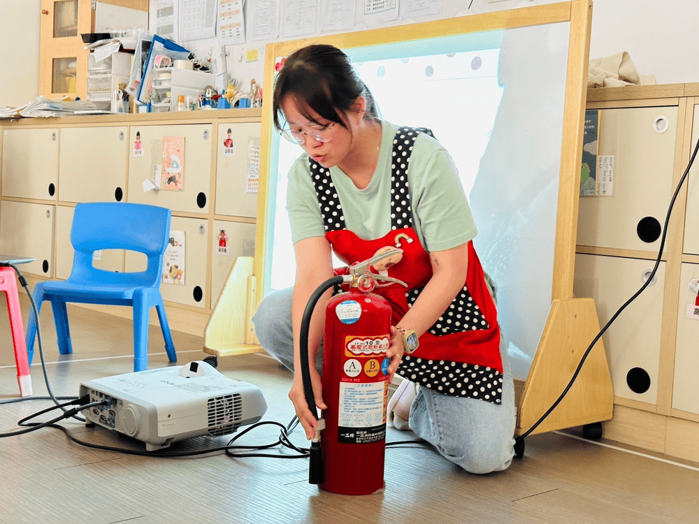 平時進行正確的消防演練,並加強幼兒的防災觀念,有助於在突發危險時能夠迅速做出正確的避難反應。透過老師的口語引導,及搭配簡報中的圖片與影片,幫助孩子了解火災的危害性及適當的防護應對方法,也帶孩子練習著火時的自救方法,例如:停、躺、滾來強化應變能力。
