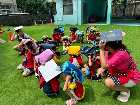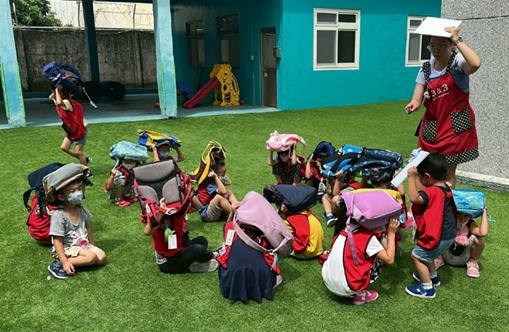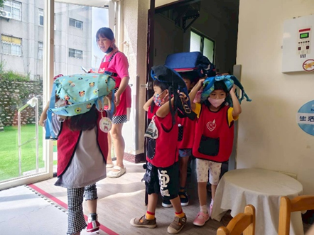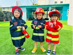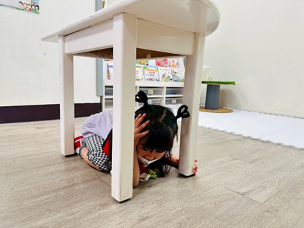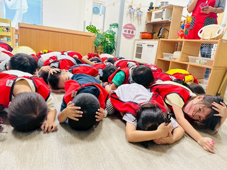 也進行地震逃生演練,讓幼兒本能地執行就地避難的 「趴下、掩護、穩住」 保命動作,每個關卡都透過「防災知識示範與演練」,加深幼兒對所有關鍵口訣的記憶,也藉由試穿消防服體驗,圓滿達成本次防災教育的目標。