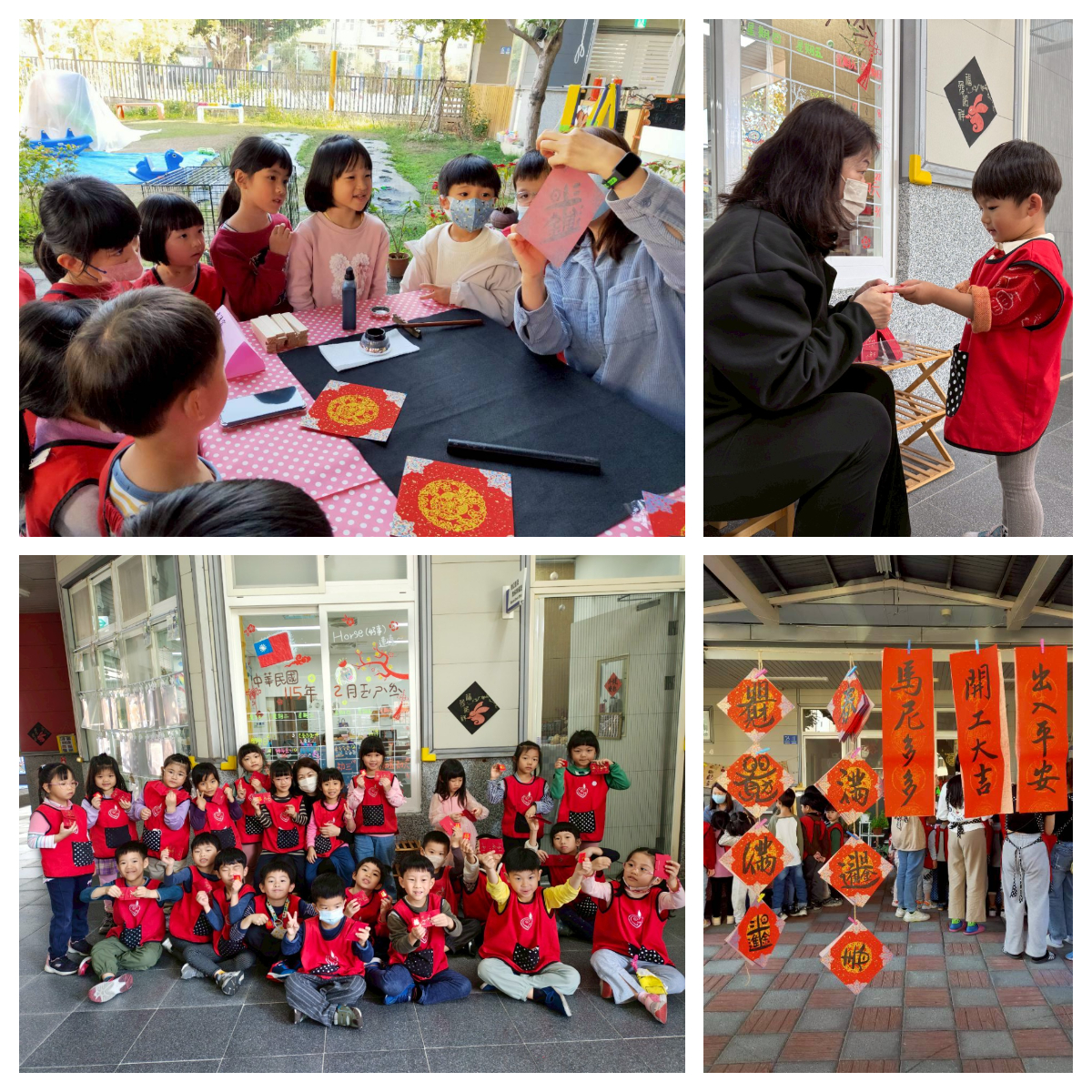 馬年到,孩子透過團圓火鍋、吉祥語領紅包、大師揮毫等相關活動迎新春,藉此提供家庭春節布置氛圍,幼兒欣賞書法之美機會。