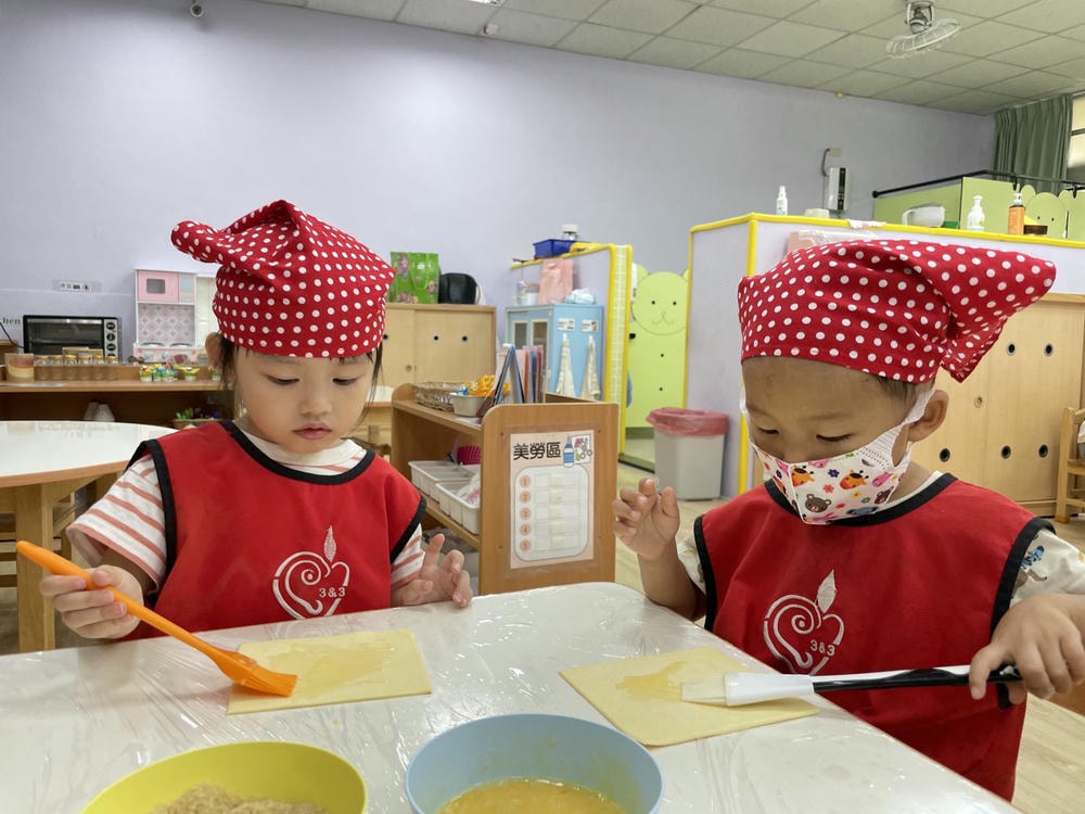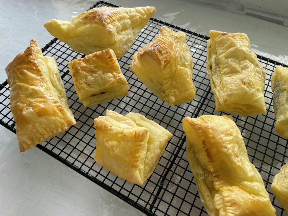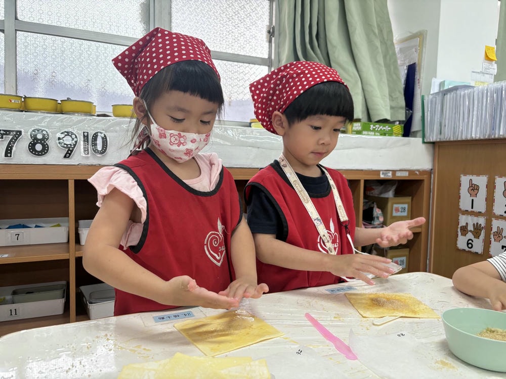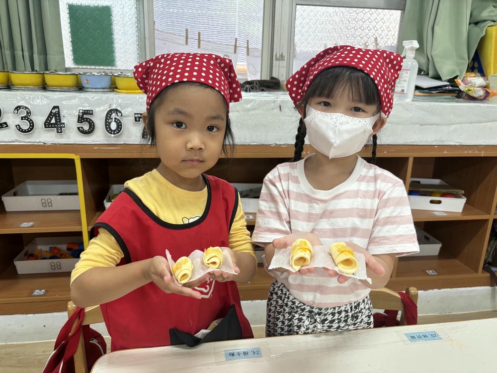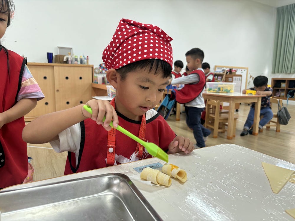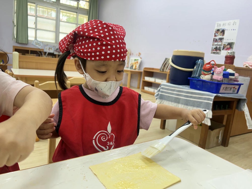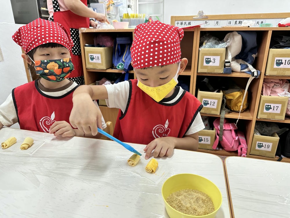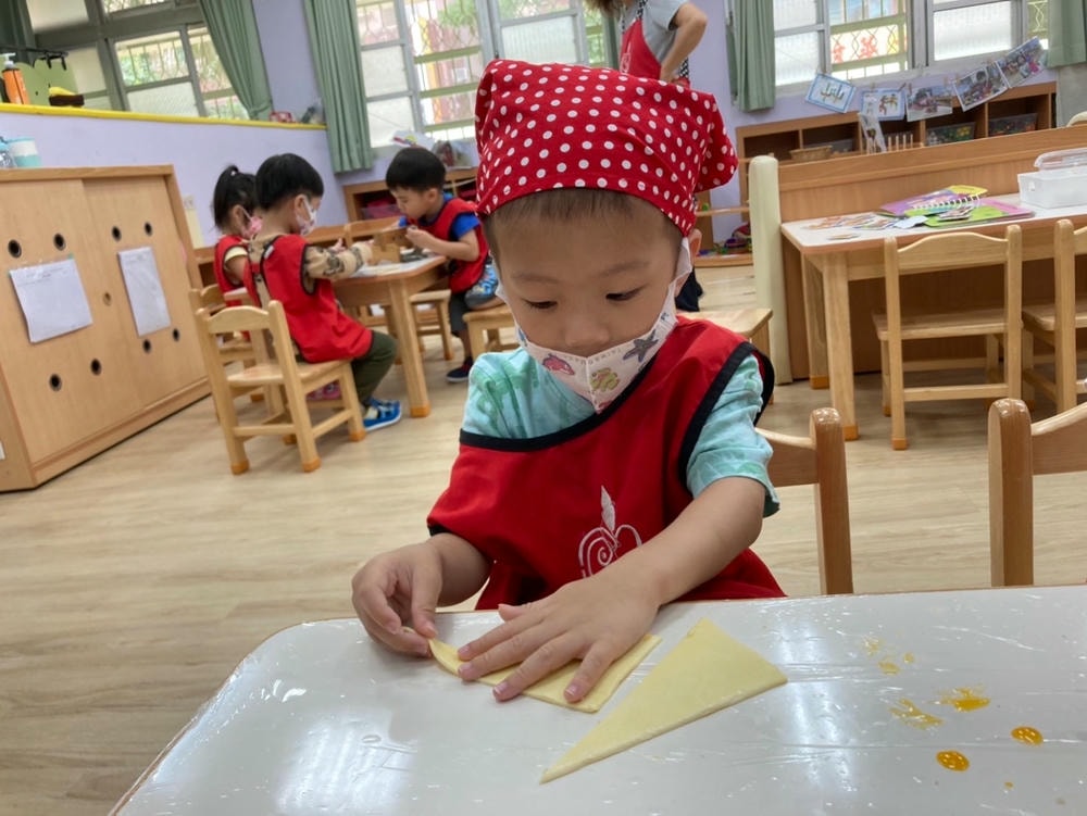 正方形的酥皮切成三角形,再捲一捲就變成了小可頌了,包入鹹鹹的起司加上甜甜的砂糖,孩子們都一口接著一口呢!
