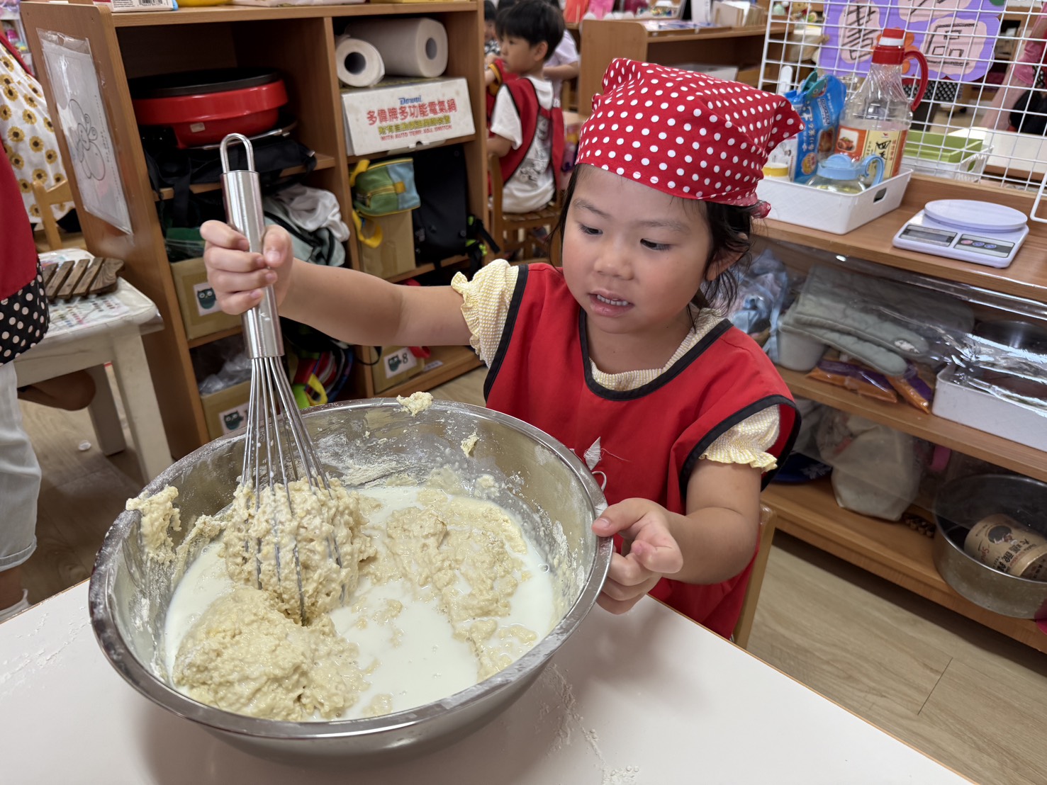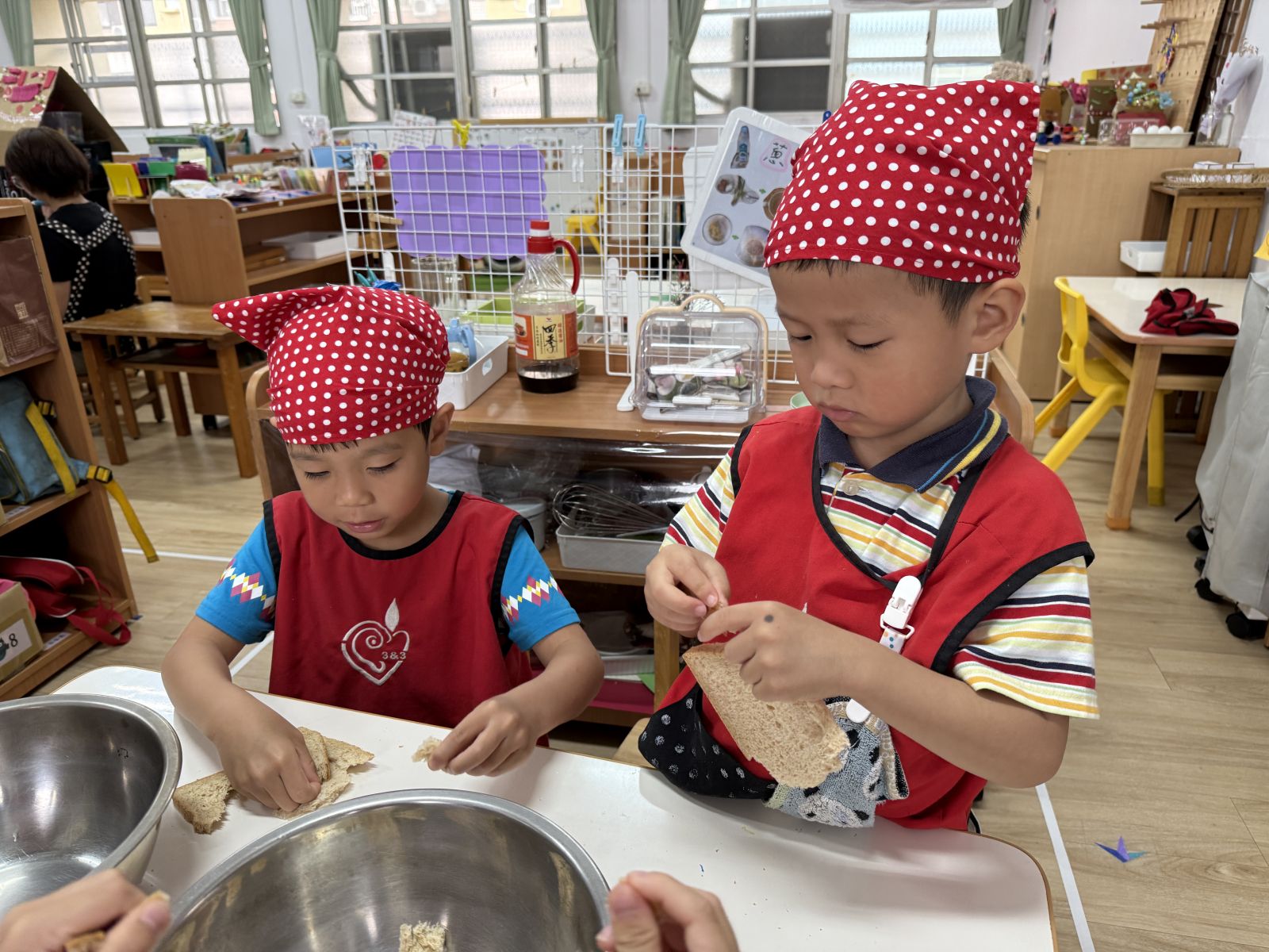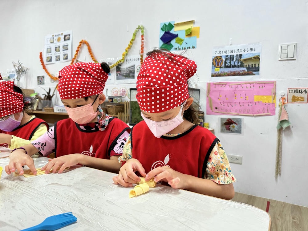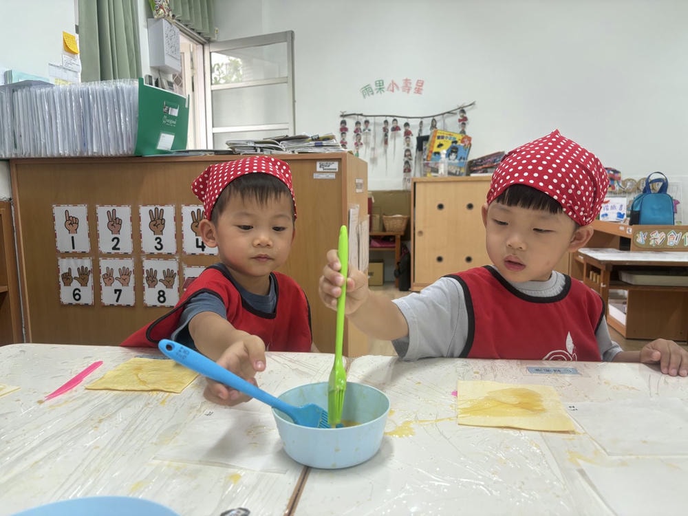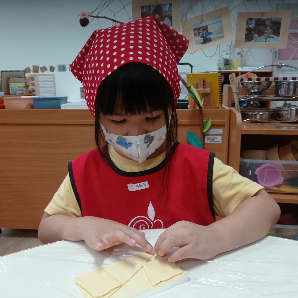 正方形的酥皮切成三角形,再捲一捲就變成了小可頌了,包入鹹鹹的起司加上甜甜的砂糖,孩子們都一口接著一口呢!
