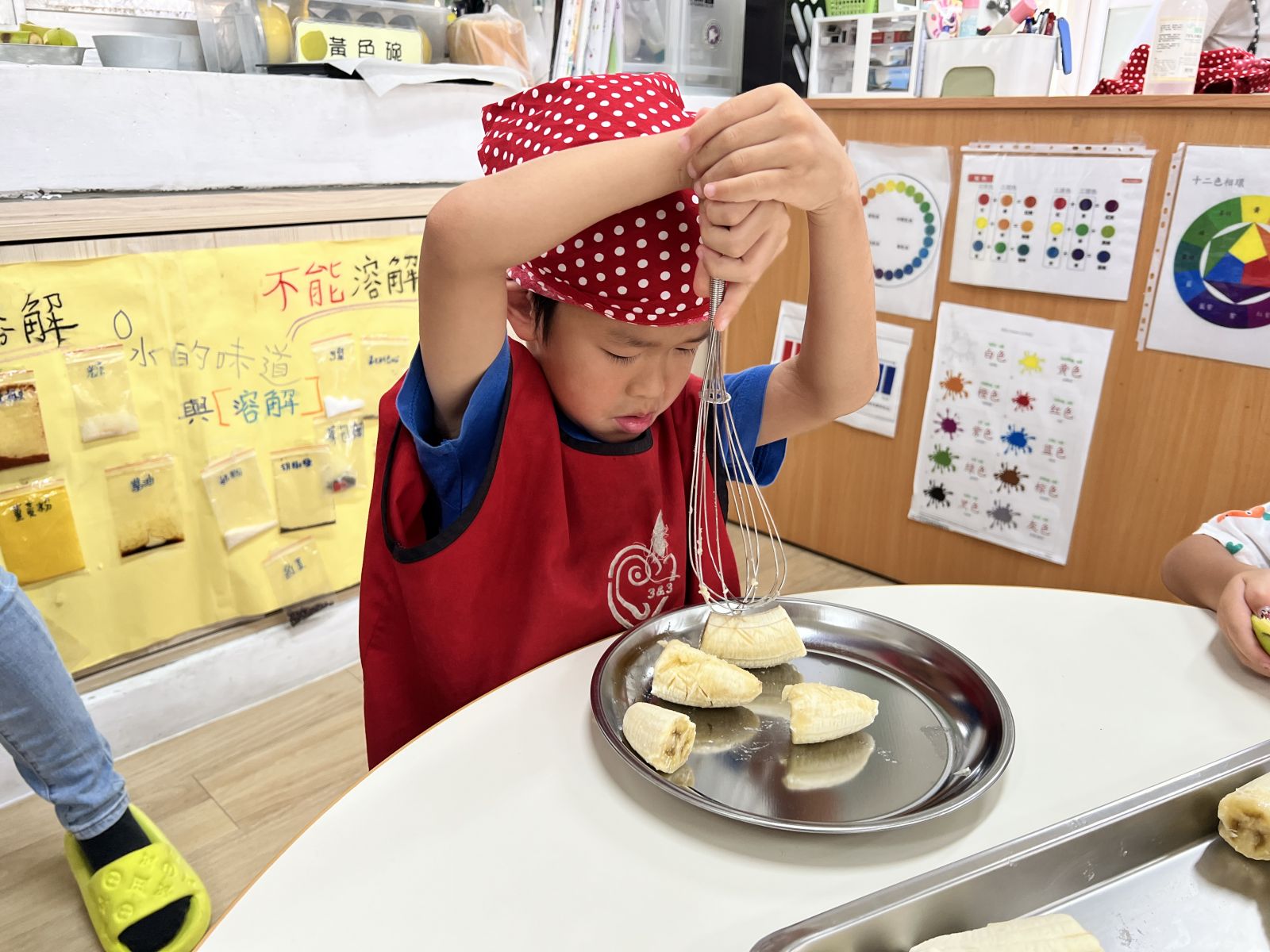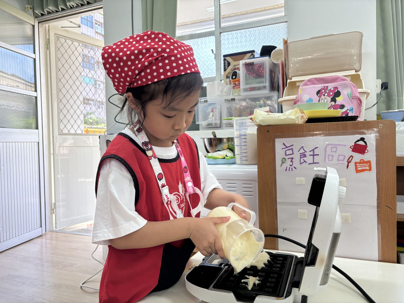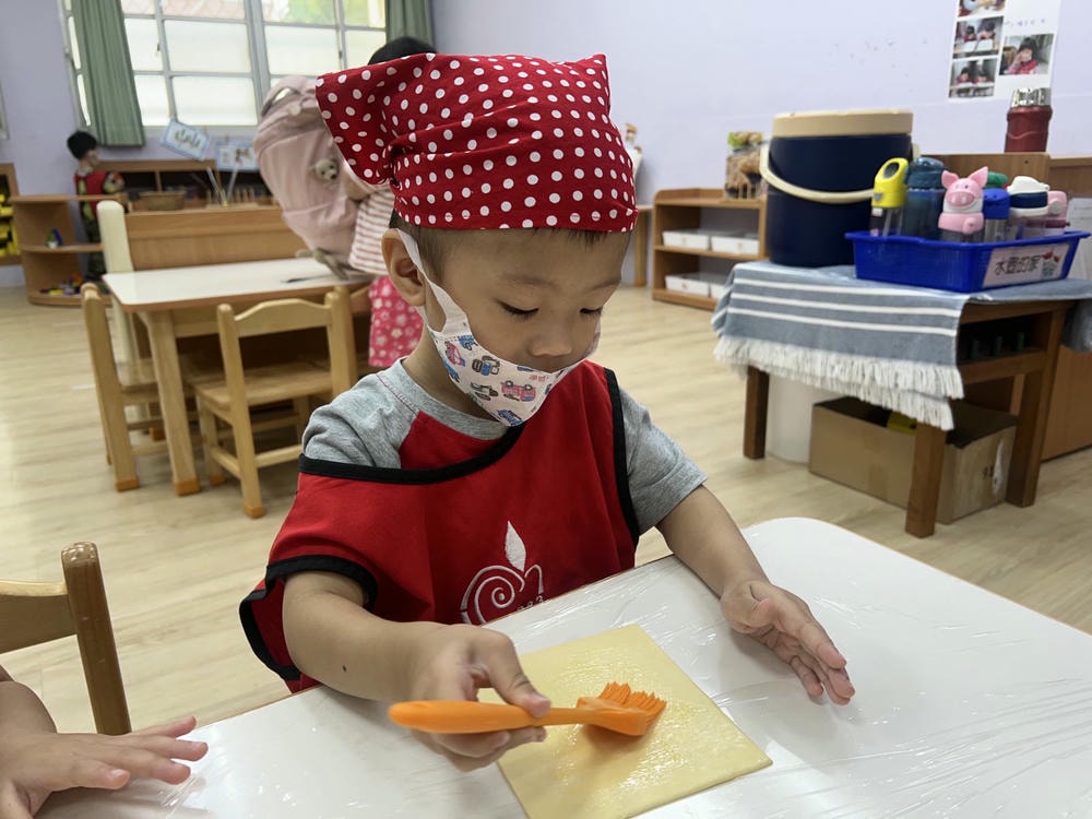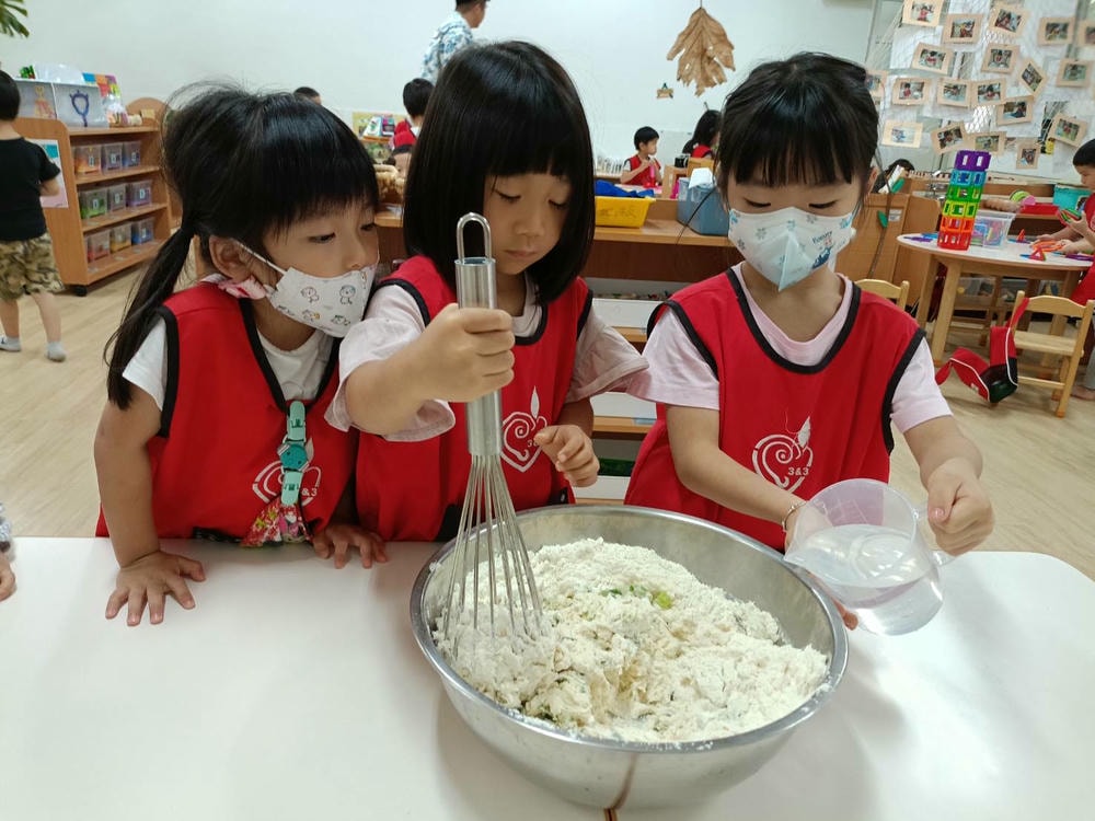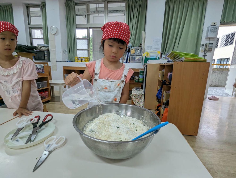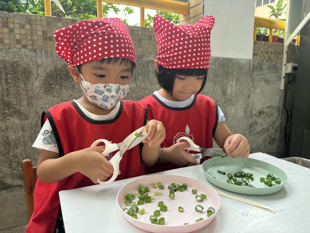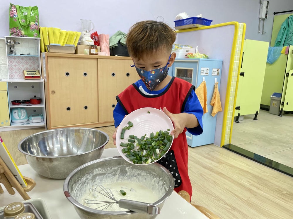 運用食物剪刀,把長長的青蔥變短,加入麵粉、水,變成香噴噴的蔥油餅。