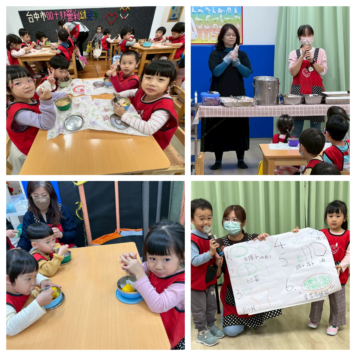 一早孩子興奮不已分享帶了什麼火鍋食材,在活動中,老師也帶入數數及認識蔬菜食物、更重要是訓練孩子手眼協調,今天是雙十好日子,大家圍爐吃火鍋,象徵過年闔家團圓,孩子也比平常多吃了好幾碗呢!