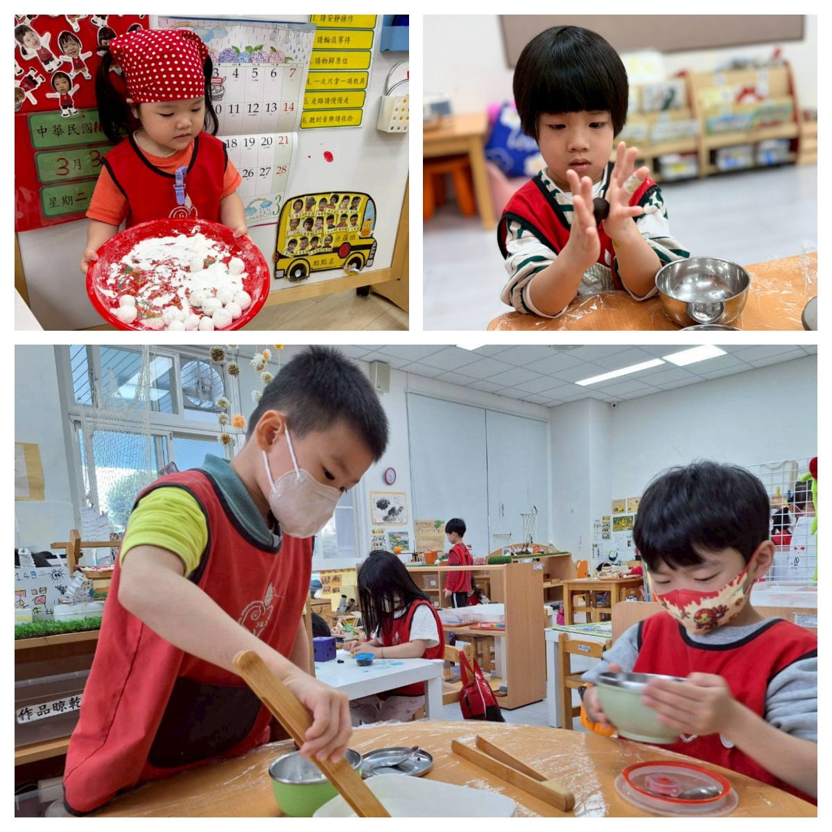 透過「滾」元宵的過程(沾水、滾粉、反覆塑形),訓練幼兒手部小肌肉發展、手眼協調能力;過程中,提升專注力與耐心、觀察變化及促進感官體驗。
