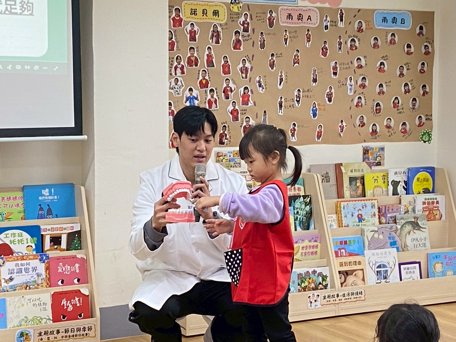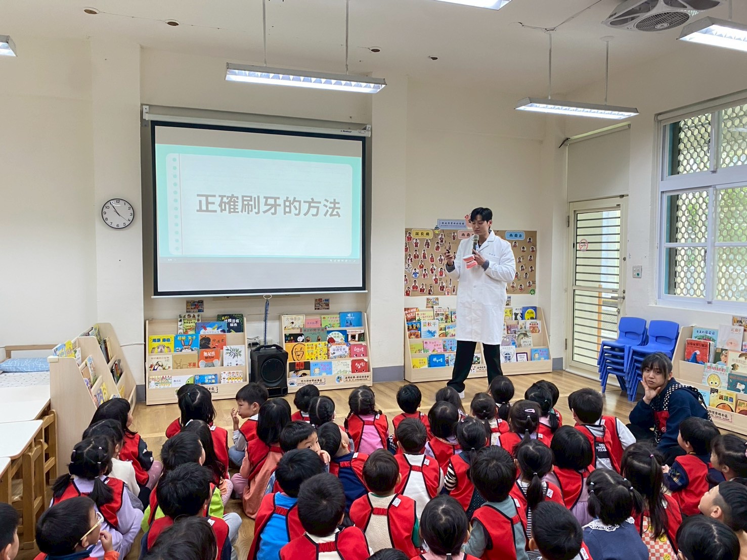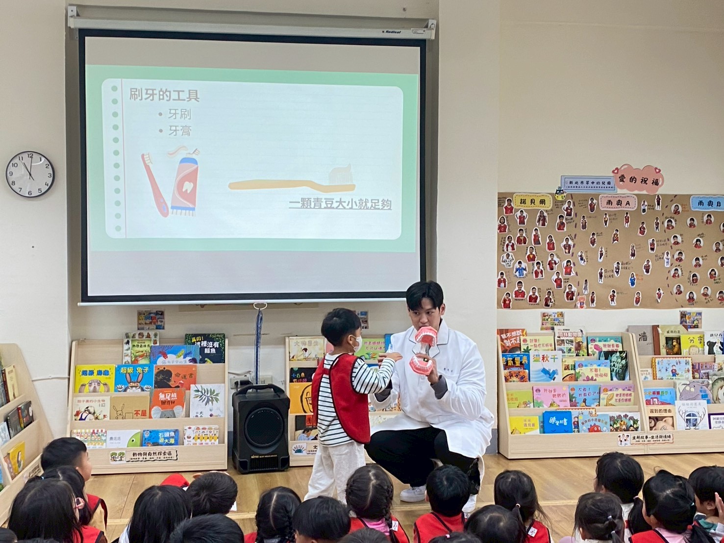透過老師的示範雨模型練習,孩子們一起學習正確的刷牙步驟: