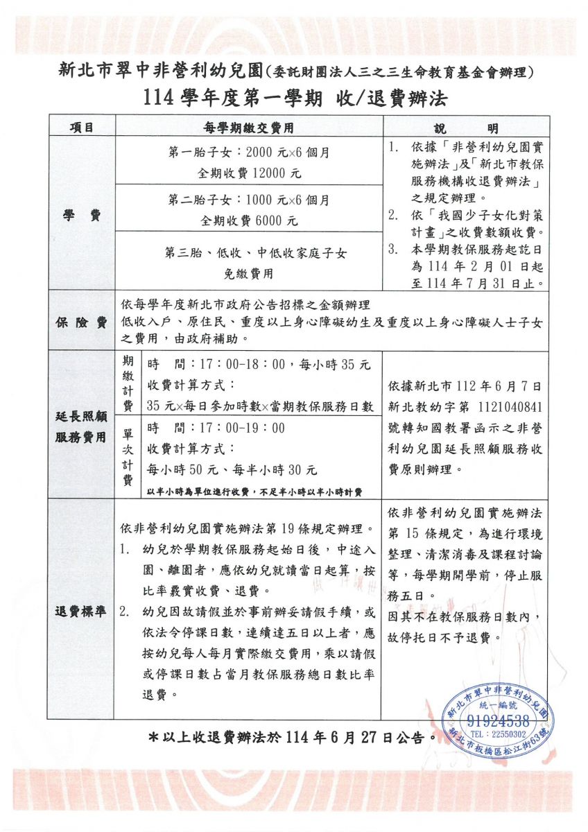 114學年度收退費辦法