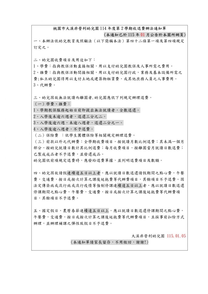 『非營利幼兒園退費相關辦法』