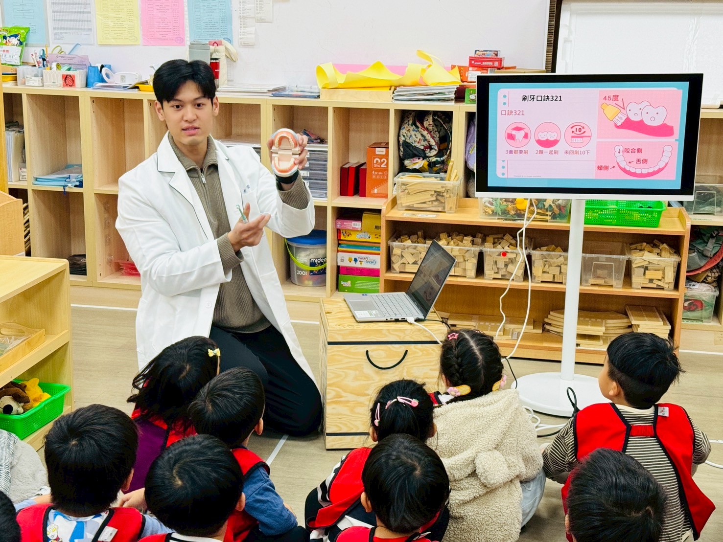 藉由故事繪本讓孩子了解正確刷牙的方式,以及刷牙的重要性!並透過投影片方式介紹刷牙會用到的工具。也透過嘴巴牙齒模型、牙刷,在現場實地操作教導孩子們如何使用牙刷以及正確的刷牙方式。讓孩子知道早上起床、飯後及睡前都要養成刷牙的好習慣,才不會讓蛀牙蟲找上門!