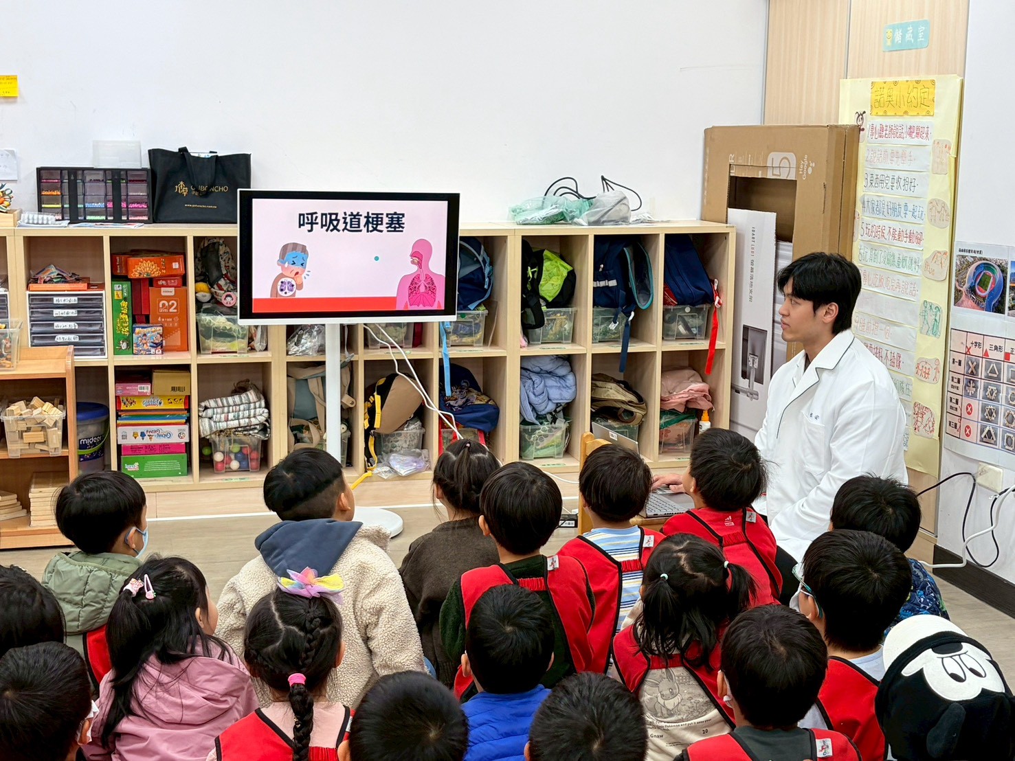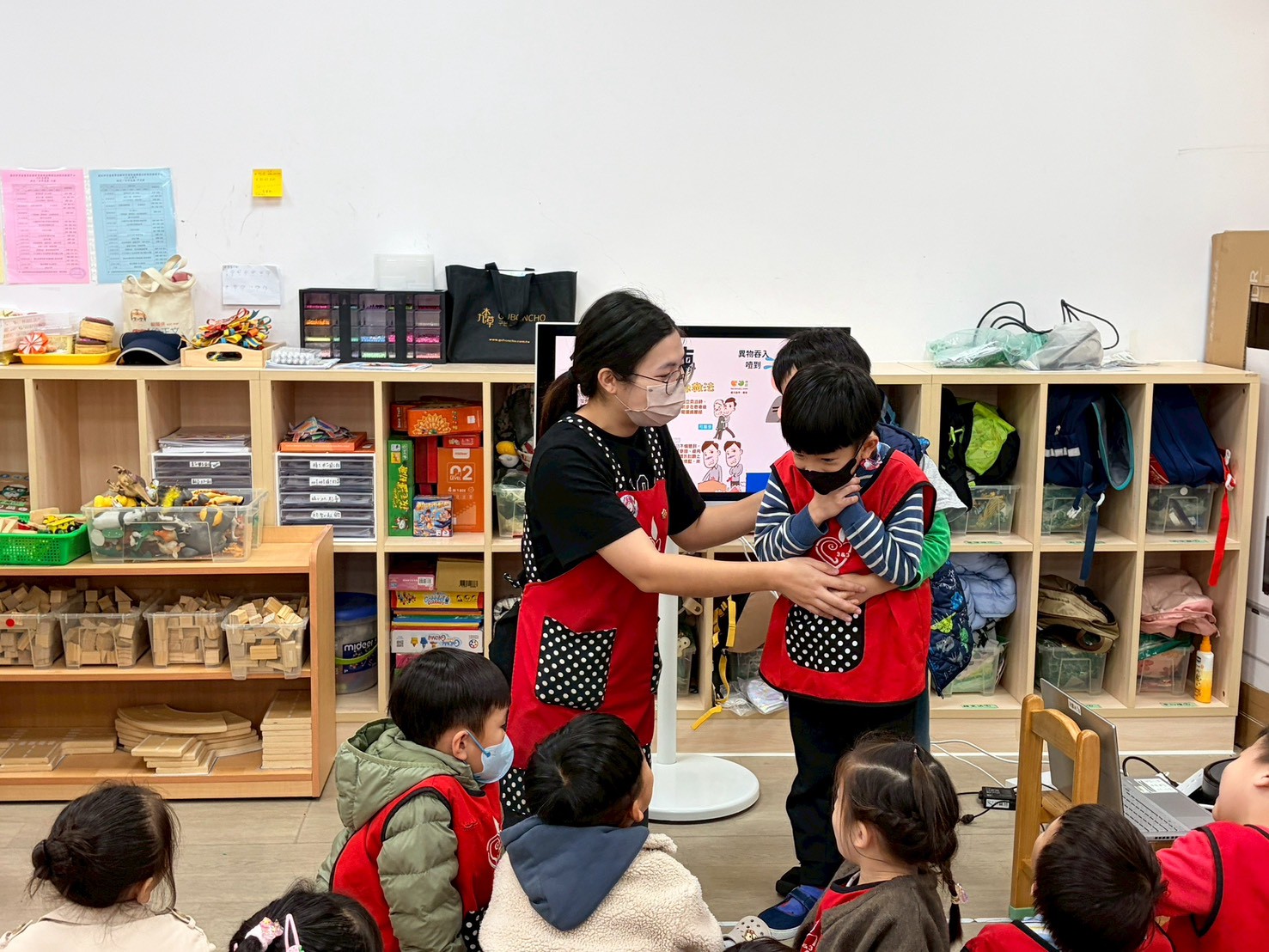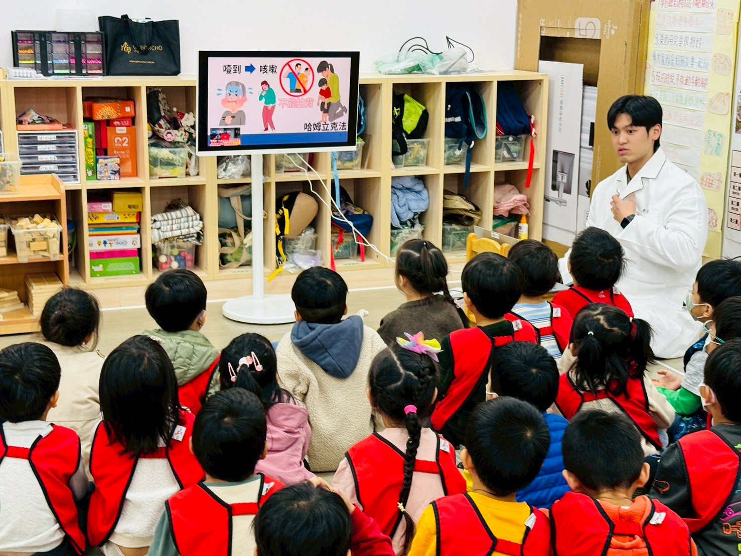 除了透過護理師影片認識這些緊急狀況發生時會有怎樣的反應之外,也實際演練一次讓幼兒知道當遇到緊急狀況時老師會如何協助幼兒。