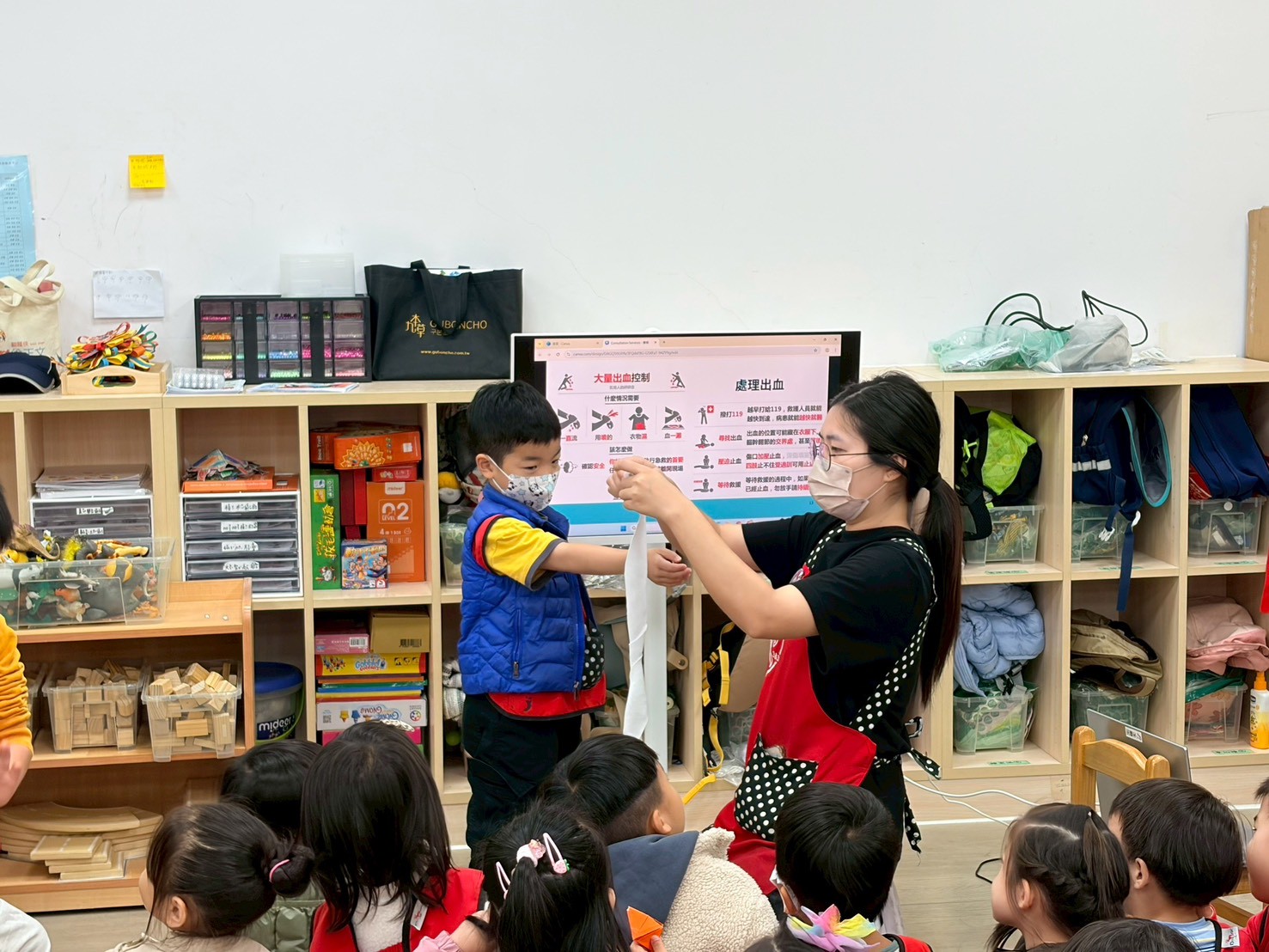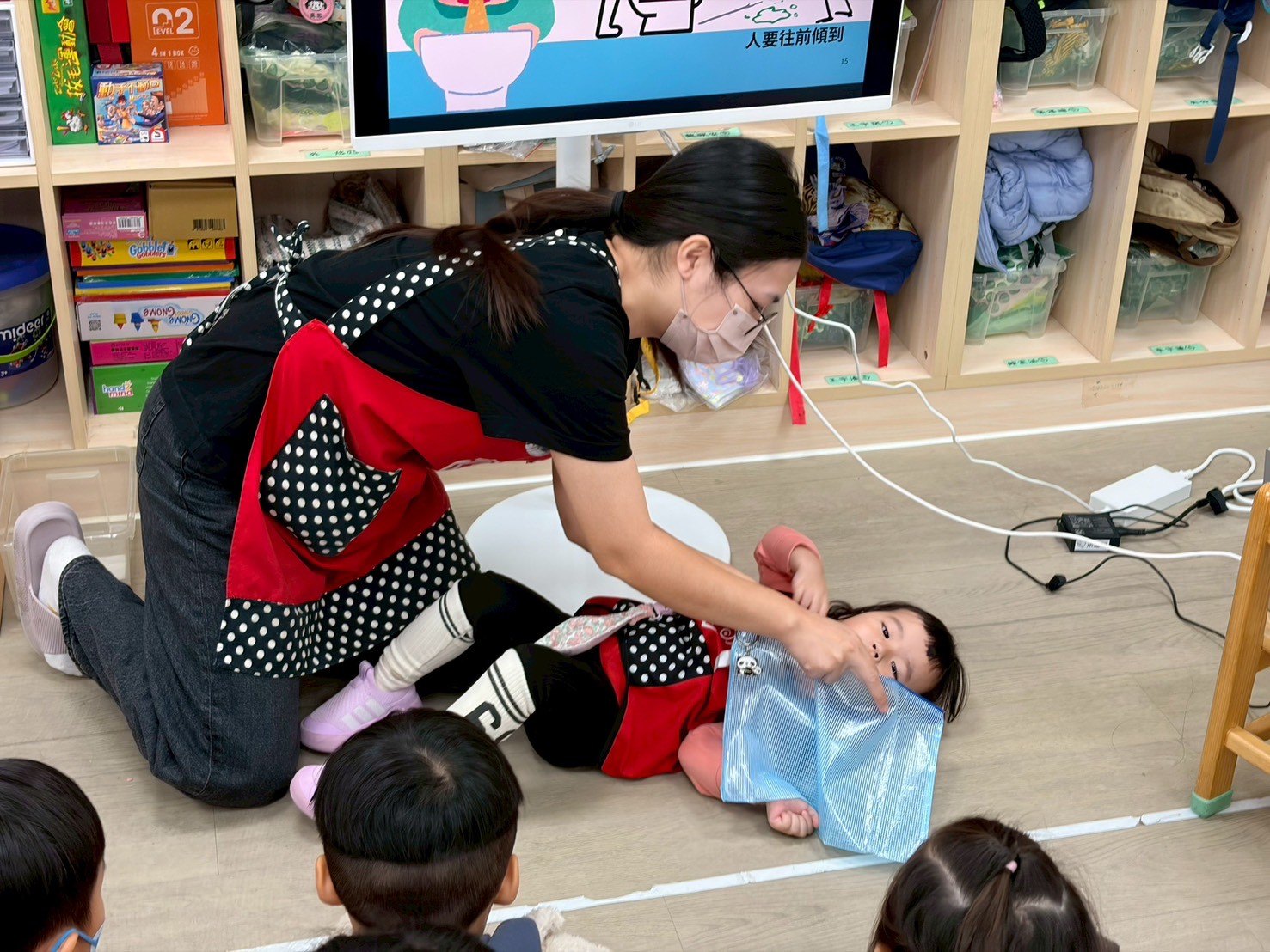 利用故事繪本及實際演練的方式,讓孩子們清楚了解遇到緊急的狀況時該如何請老師幫忙,以及也讓老師們跟著護理師專業的知識更知道如何幫助孩子們排除狀況。
