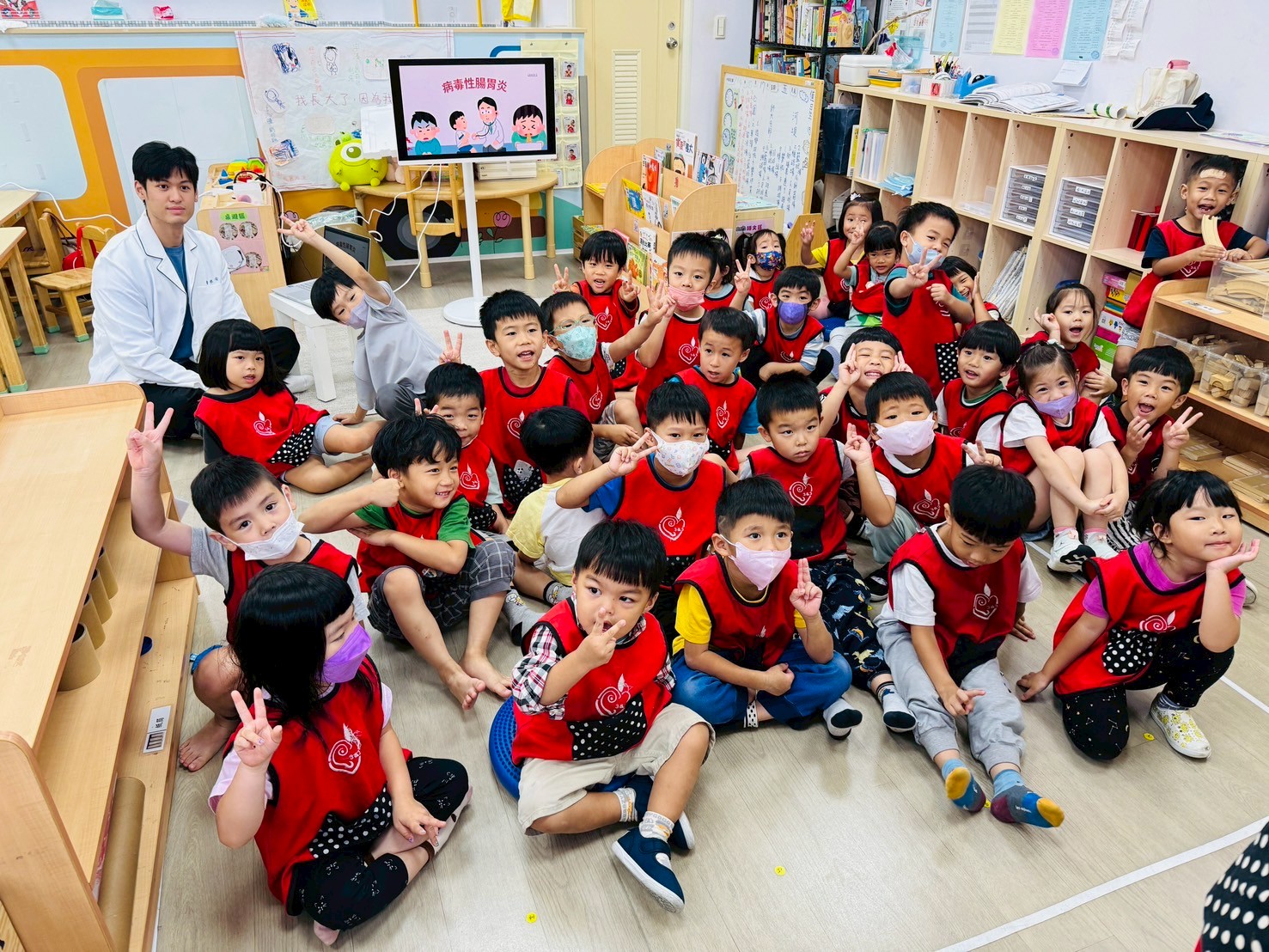 這次的衛教時間孩子們和護理師一起認識「腸病毒」,透過影片與護理師的講解邊看邊學認真記下守護自己與同學健康的小方法,學習勤洗手、不共食、身體不舒服要請假休息的健康守則!