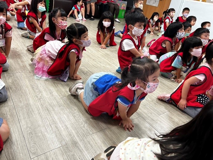 小朋友在老師的帶領下,依照口令迅速躲到安全位置,再有序地走向避難空間,展現了團隊合作與自我保護的能力。