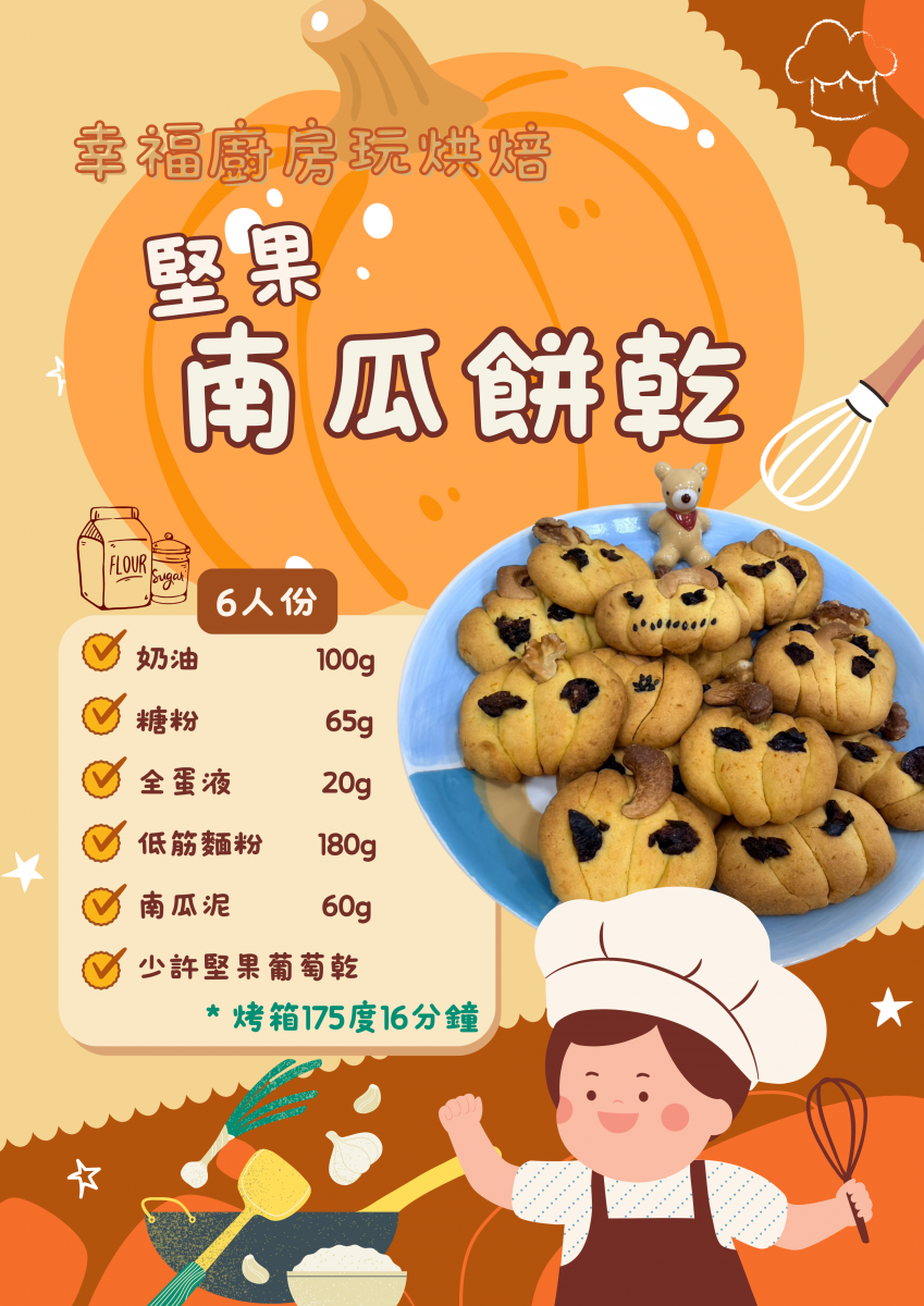 這次的烘焙活動帶領大家製作與萬聖節相關的堅果南瓜餅乾喔!我們一起認識食材,並且混合攪拌揉成麵糰,再試著將麵糰搓長條,切段後將麵糰壓扁或搓長條製作成南瓜造型的餅乾,最後加上果乾和南瓜籽裝飾,等烤好就可以裝入包裝袋,帶回家和家人分享喔!