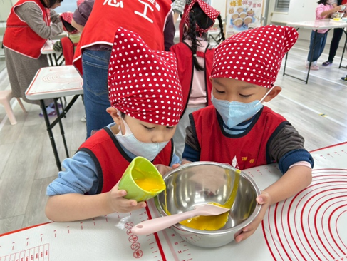 11月是立冬的月份,在這寒冷的冬天,我們要用黑糖做個小圓餅;經過老師的帶領,一起認識食材,並且混和攪拌揉成麵糰,再試著將麵團搓長條,切段後再自己將麵糰壓扁,並在壓扁的麵糰加上南瓜子裝飾,等烤好就可以裝入包裝袋內袋回家和家人分享喔!!!