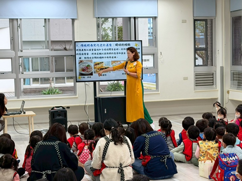 本次的多元文化活動帶領幼兒認識不同國家文化的特色,透過簡報和影片了解越南在食、衣、住、行等方面的文化特徵,老師也穿上了越南的傳統服飾,邀請幼兒欣賞不同國家服飾的美。最後,引導幼兒說說看越南的禮貌用語-你好、謝謝、再見等,幼兒都覺得相當新鮮有趣喔!大家也從中學會尊重自己與他人在文化上的相同與差異,促進文化理解與接納。