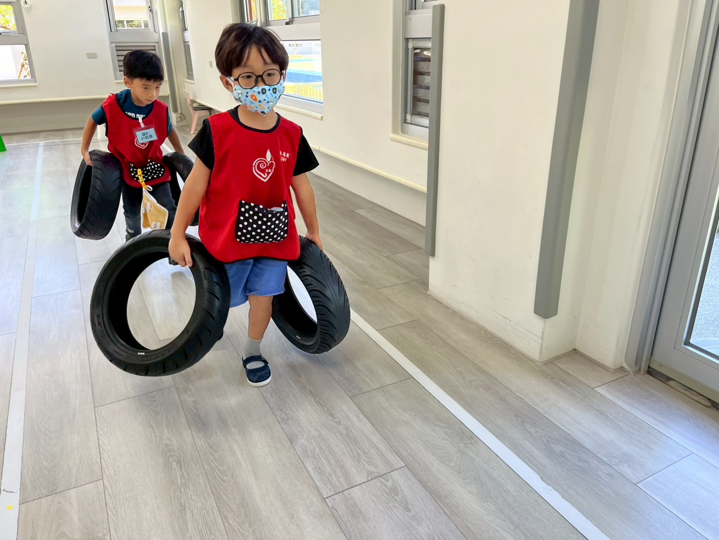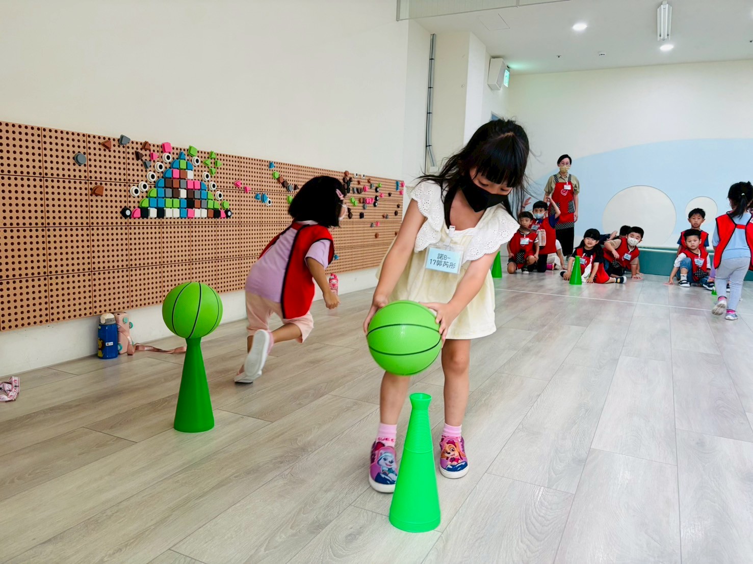 活動目標:1.訓練下肢體肌耐力 2.能控制拍球的力道 3.提升上下肢協調性 4.能協調身體騎乘三輪車