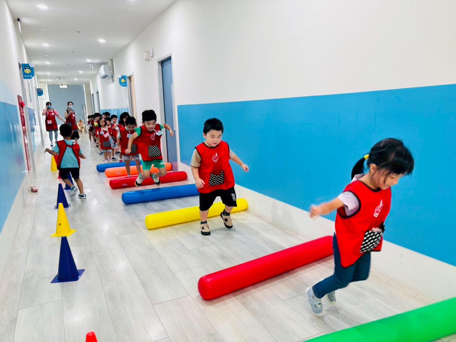 活動目標:1.刺激幼兒神經反應及控制本體活動 2.培養下肢肌耐力 3.培養團隊合作精神及空間概念 4.增進幼兒的動作協調的能力