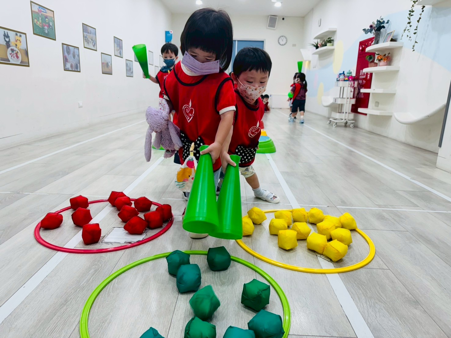 活動目標:1.覺察身體活動安全的距離 2.增加肢體的協調性 3.能將小布球丟進桶子裡面 4.提升身體動作協調性