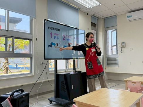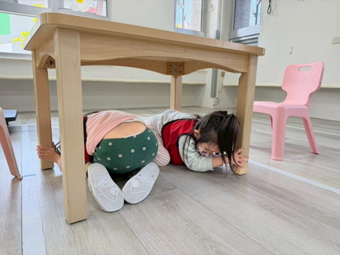 台灣處於地震活躍的地帶,之前的921大地震就造成了很多傷亡,因此平時的防震防災教育絕對不能少,老師運用淺顯易懂的影片讓孩子知道地震時可能會發生的事,例如:東西倒落、被物品砸傷、房屋倒塌,再透過實際演練來練習躲到桌子底下及就地掩護的動作,讓孩子們對防震三步驟「趴下、掩護、穩住」的口訣的印象深刻,而在班級的實際演練中,孩子們聽到地站警報聲的音效後,都可以立刻就地掩護,做得很好喔!
