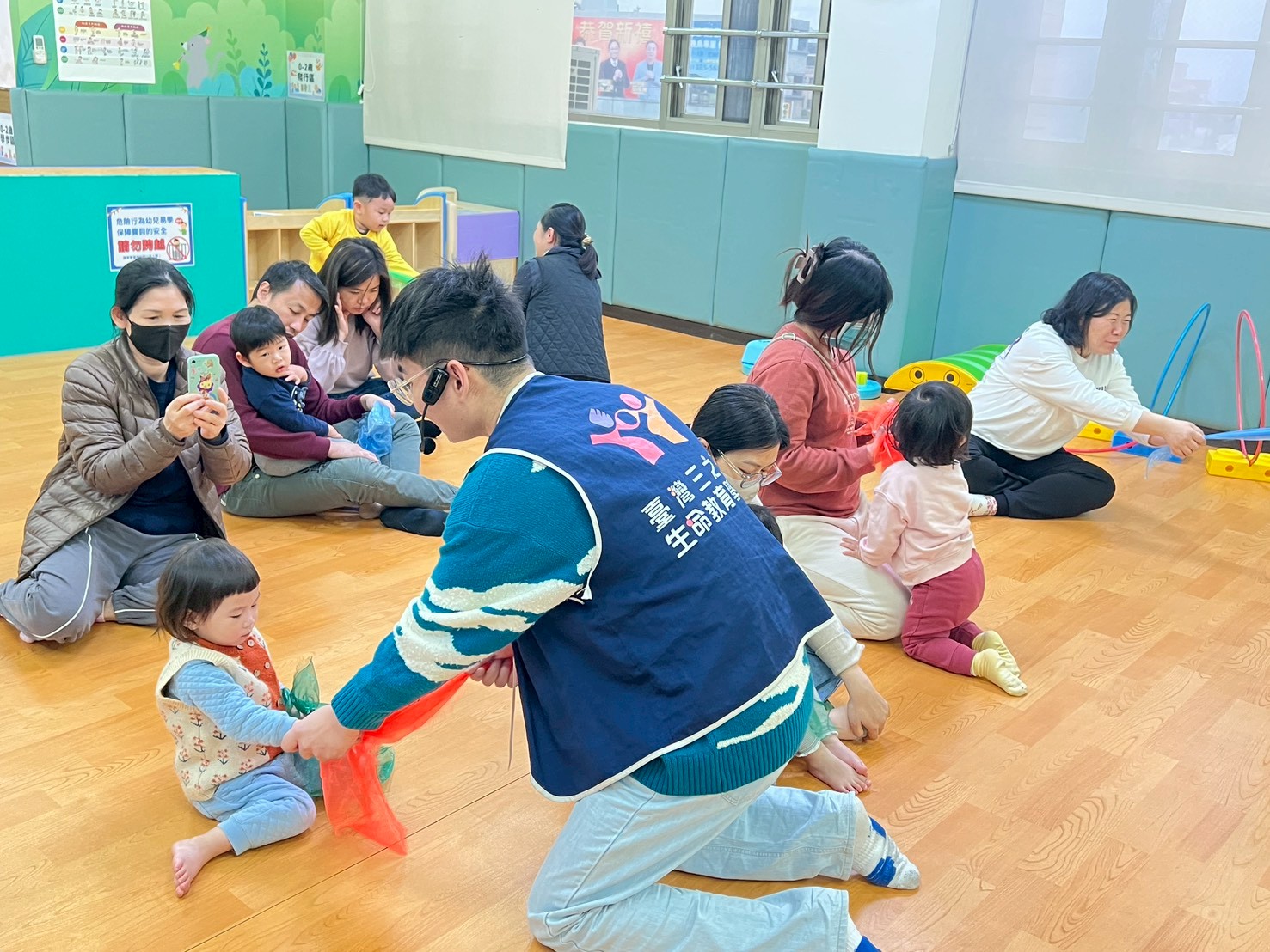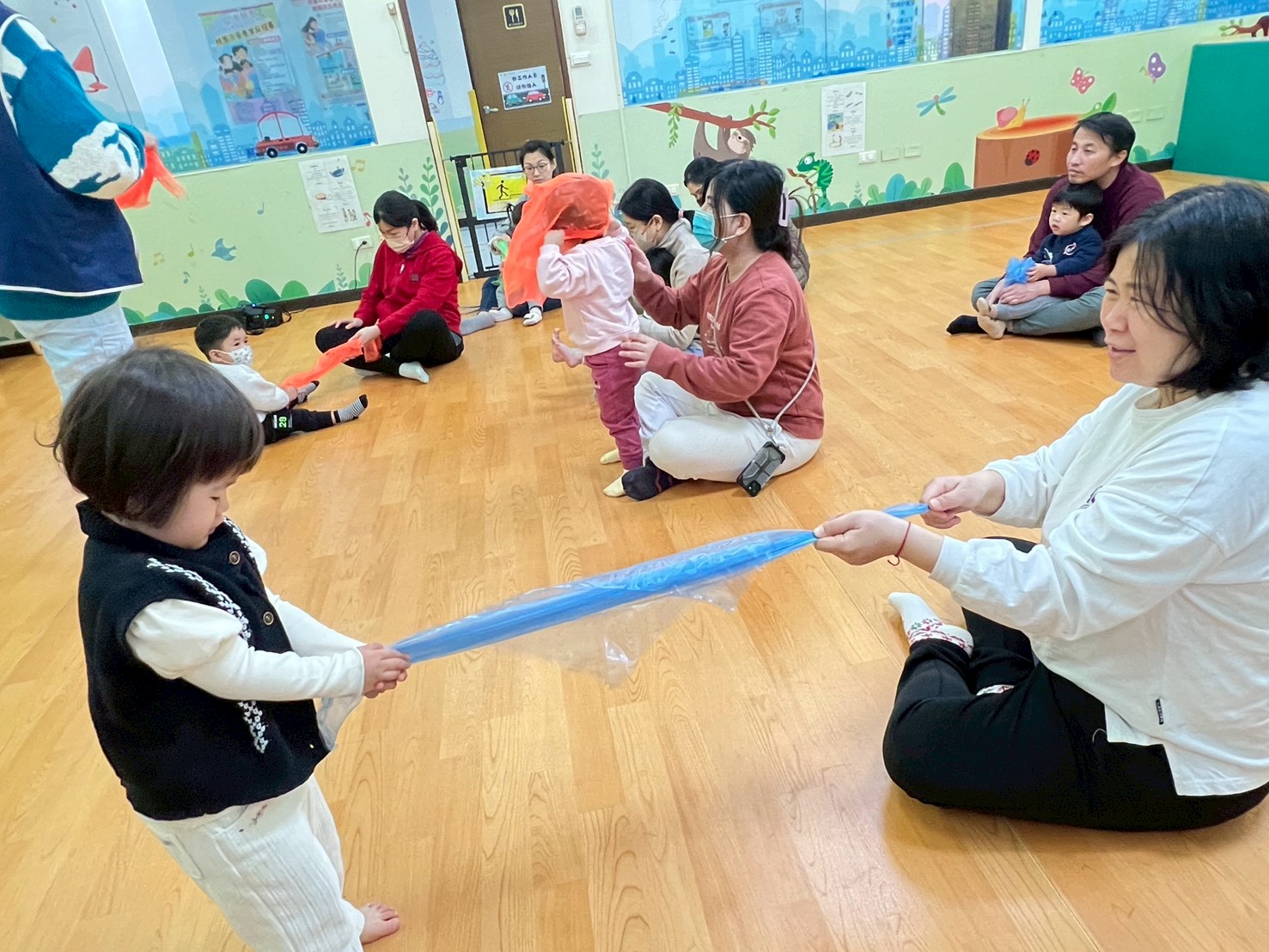 家長透過不織布一同合作將幼兒捲起來變成春捲,並且一起玩許多有趣的遊戲