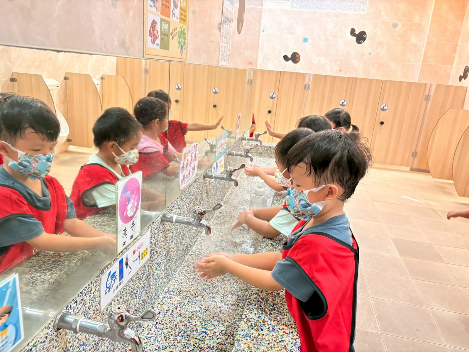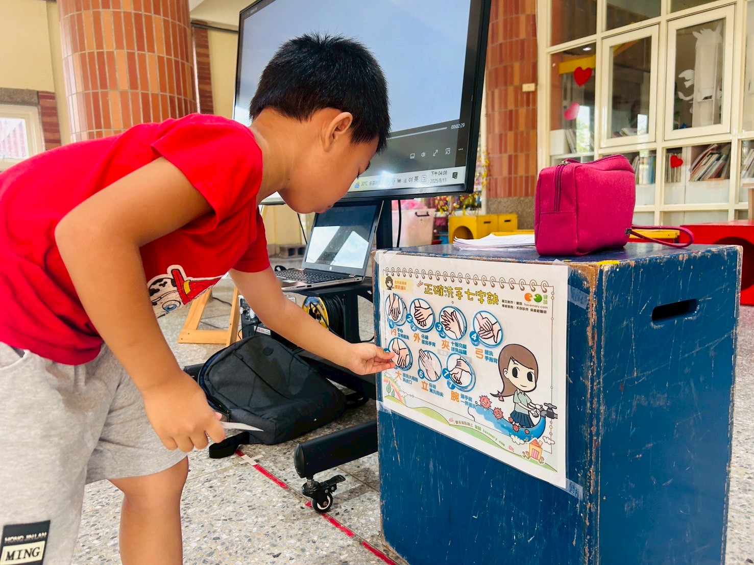最後,請小朋友實際依照正確洗手五步驟進行練習與七字訣「內外夾弓大立腕」的圖片對應