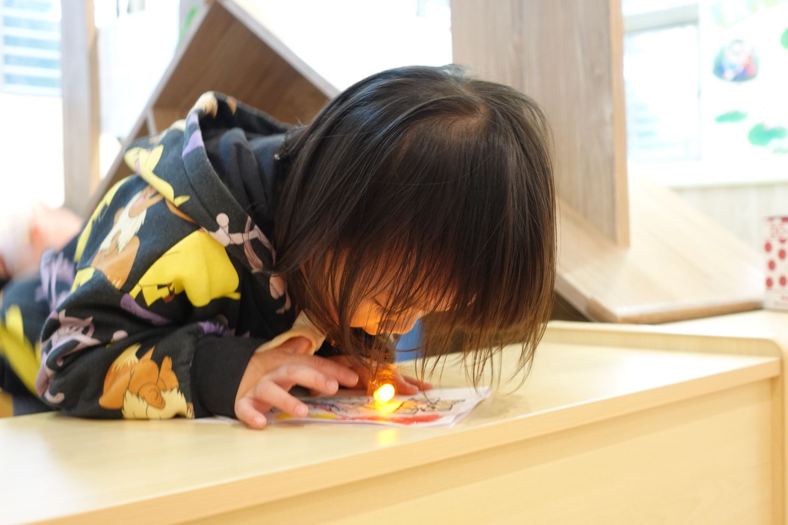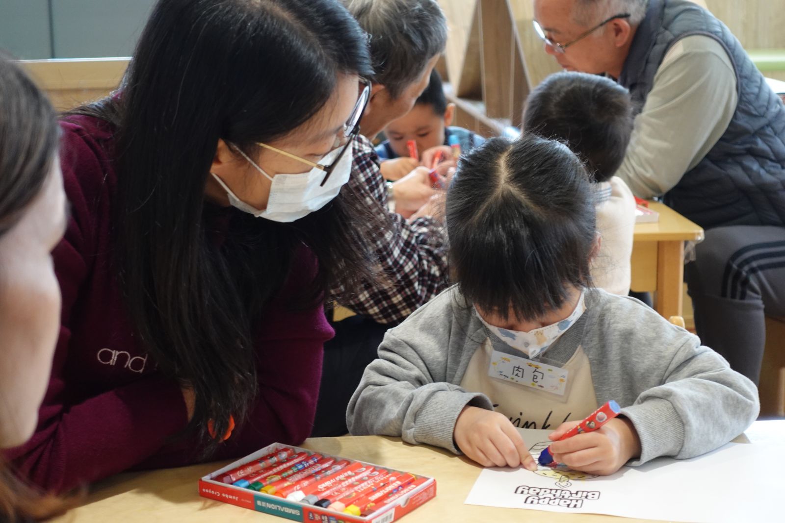 老師帶領親子用手語唱「生日快樂」歌,並透過可發光的繪本引發興趣。接著引導親子一起製作發亮的生日卡片,從著色、貼上銅箔膠帶到安裝燈泡與電池,完成簡單電路。最後一起測試蠟燭是否發光,親子在動手做中體驗科學與創作的樂趣。