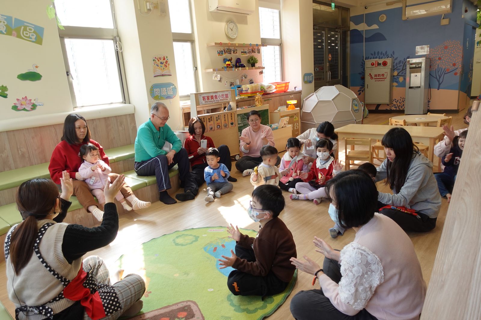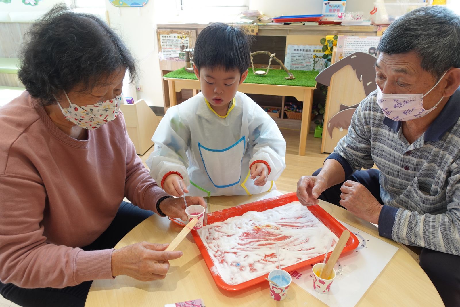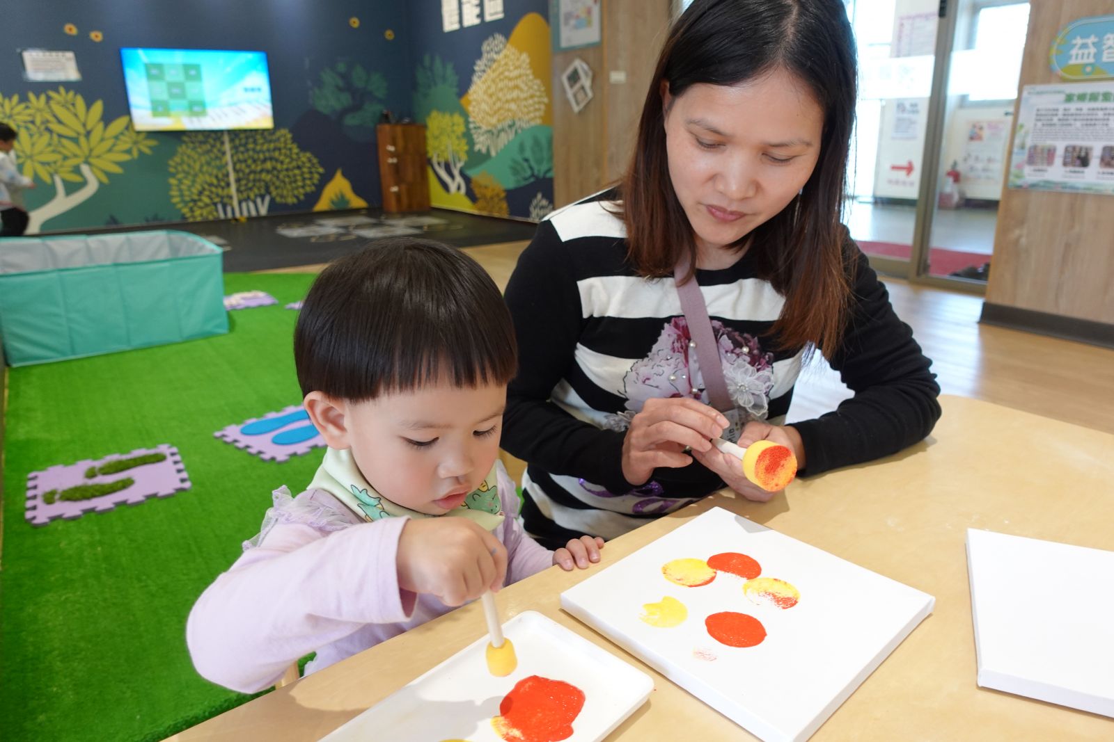 老師帶著親子用手指謠認識新坡社區的地標。接著親子一起用顏料「畫我們的社區」,有的親子畫高樓,還幫每層樓上色,也有的人畫出彩色的樹、星星。最後老師請幼兒選擇一輛玩具車,並將玩具車沾上顏料在紙上滑行,創造出繽紛馬路,一起完成充滿創意又溫馨的社區!