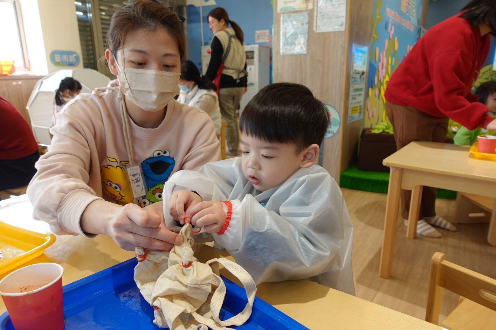 老師帶領親子認識土壤的顏色與功能,並觀察土中生物,接著引導幼兒在土裡找出玩具小蟲,體驗觸摸土壤的感受。之後介紹泥染,帶領親子一起綁橡皮筋、浸染與搓揉帆布袋,最後透過清洗與黃豆水固色完成作品。親子在探索與動手做中,認識土壤並體驗自然素材的創作樂趣。