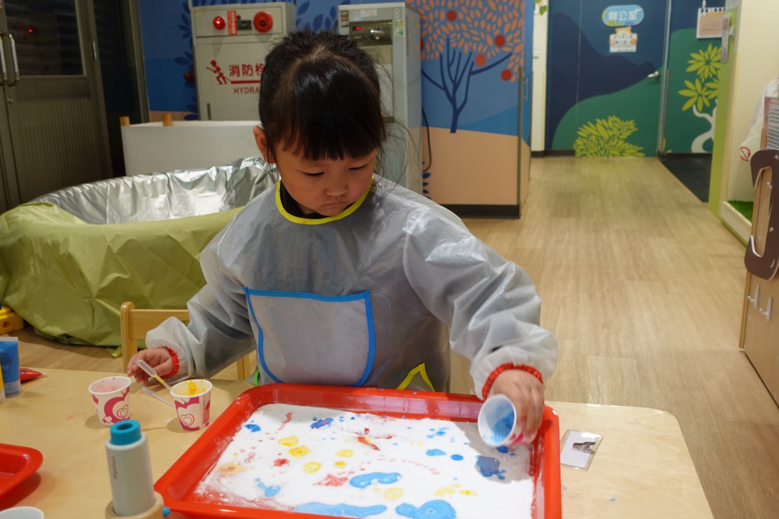 老師透過《小藍和小黃》繪本帶領親子認識顏色與混色變化,接著引導親子將顏料與醋混合,並用滴管滴在小蘇打粉上,觀察產生繽紛泡泡。最後在無框畫板上蓋印創作,嘗試不同顏色的融合,親子在實驗與創作中感受色彩的美麗與樂趣。