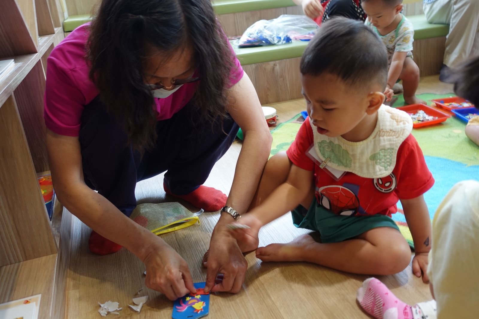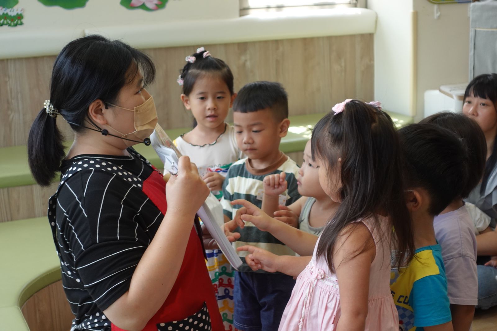 老師帶著親子一起讀《謝謝你!小幫手》,故事中的小孩做了好多家事,雖然有些失誤,但主角的媽媽總是和他說:謝謝你呀!小幫手,原來平時在家也可以讓孩子一起參與做家事,培養責任感和自主能力。接著親子跟著老師一起嘗試動手擦桌子、洗抹布、一起擺餐具,當一日小幫手,原來家事也可以變成美好的親子時光呢!