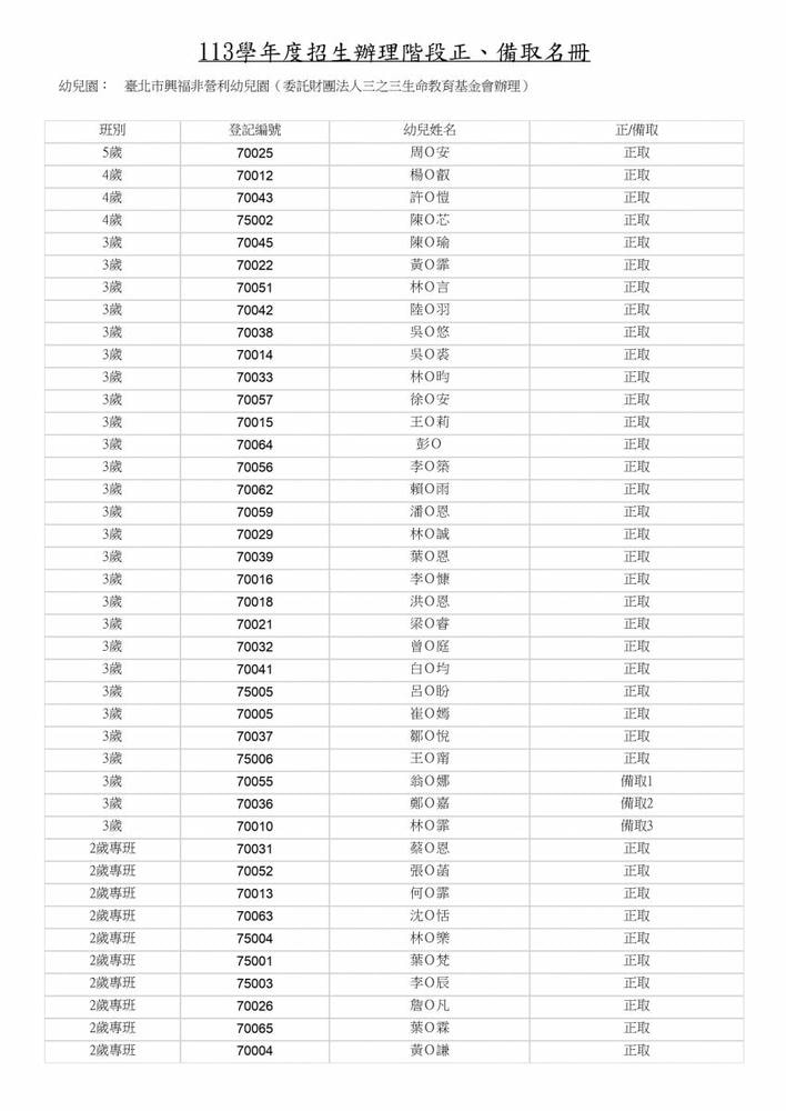 113學年度興福幼兒園線上抽籤結果