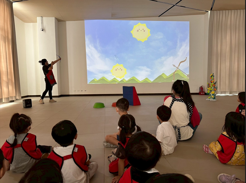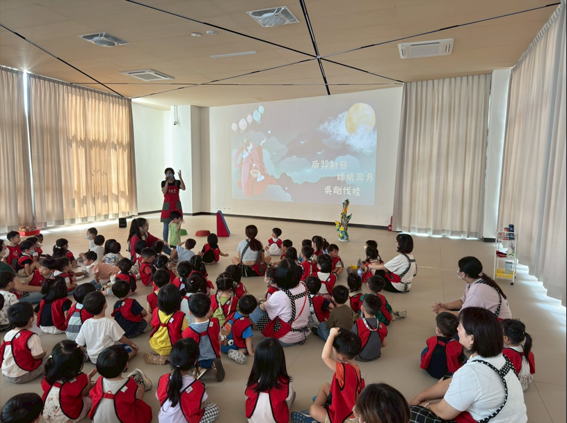透過學校老師製作PPT及搭配演戲,講述后羿射日、嫦娥奔月、吳剛伐桂三種故事