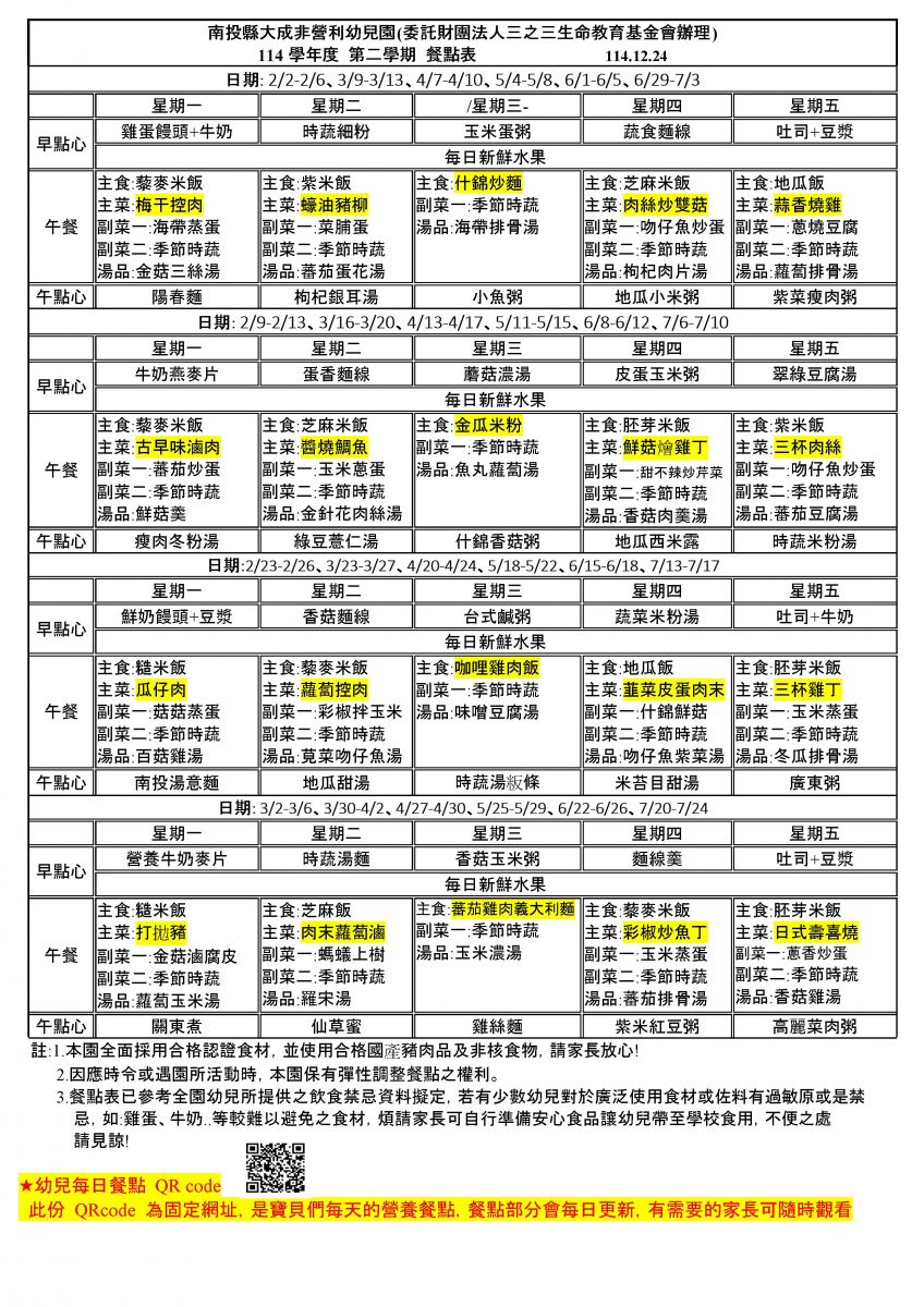 餐點表