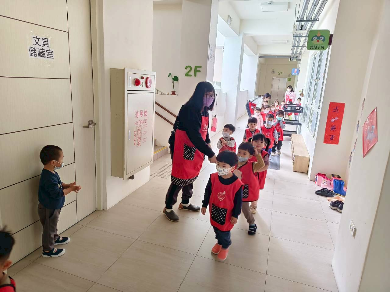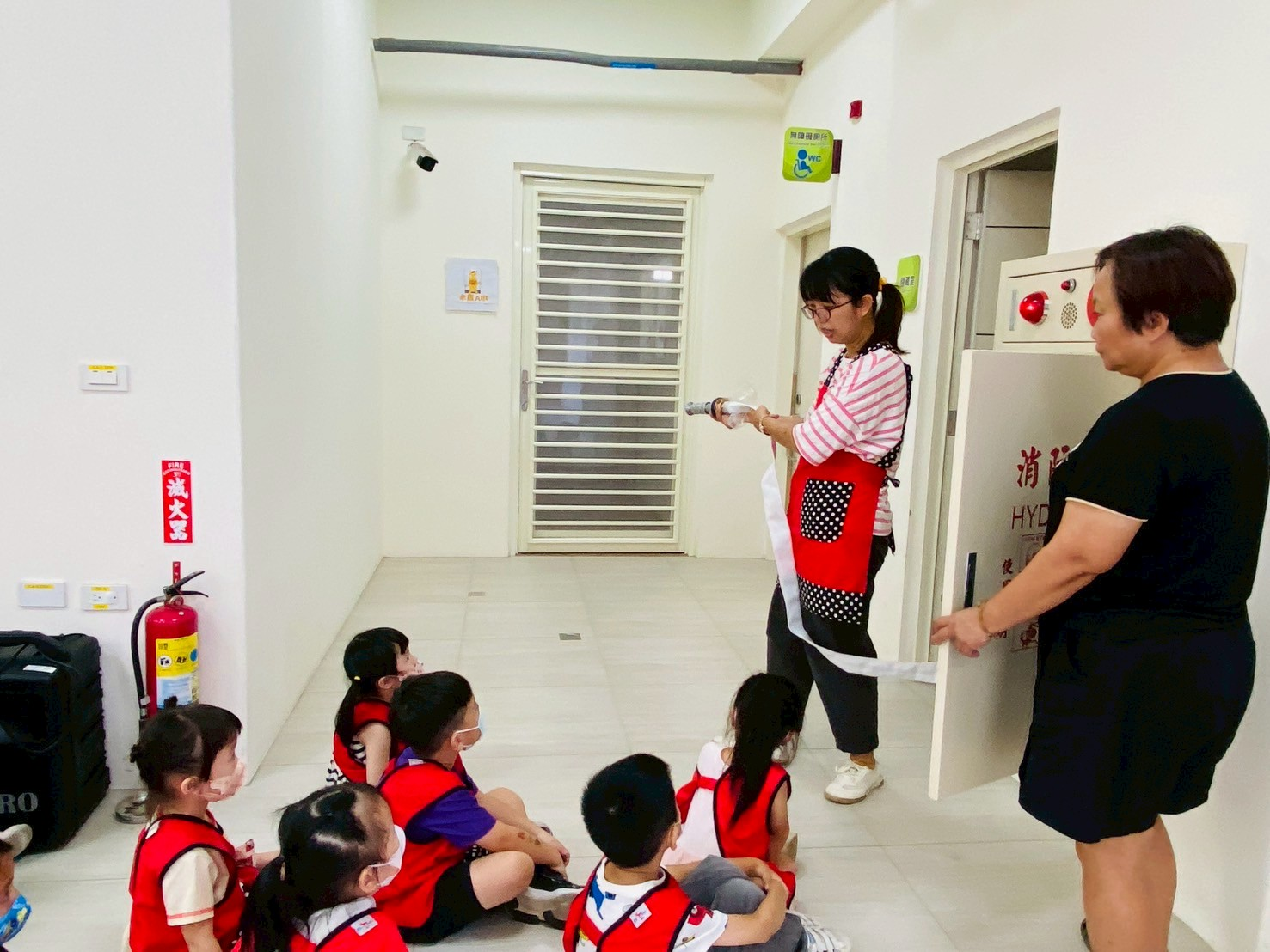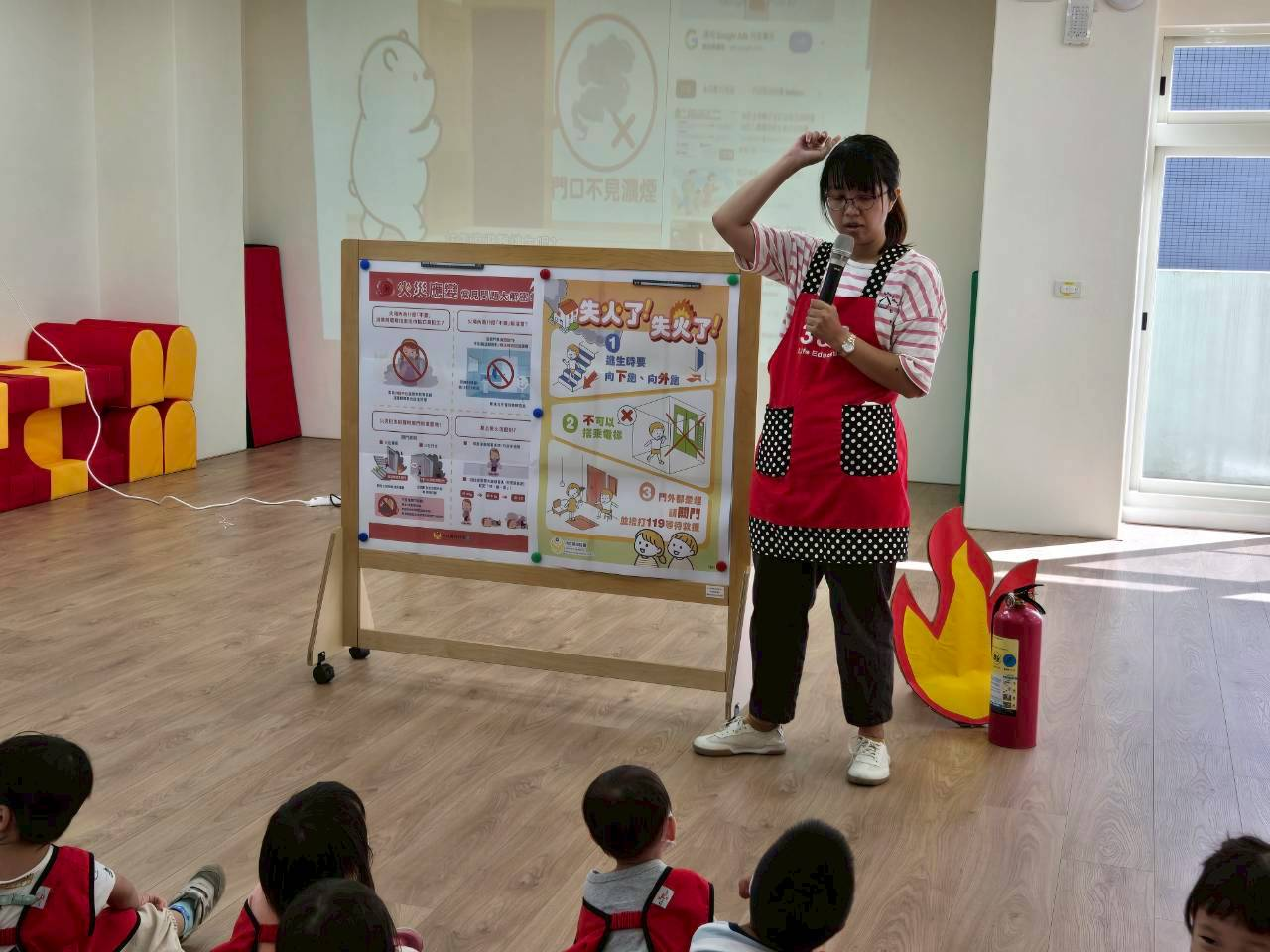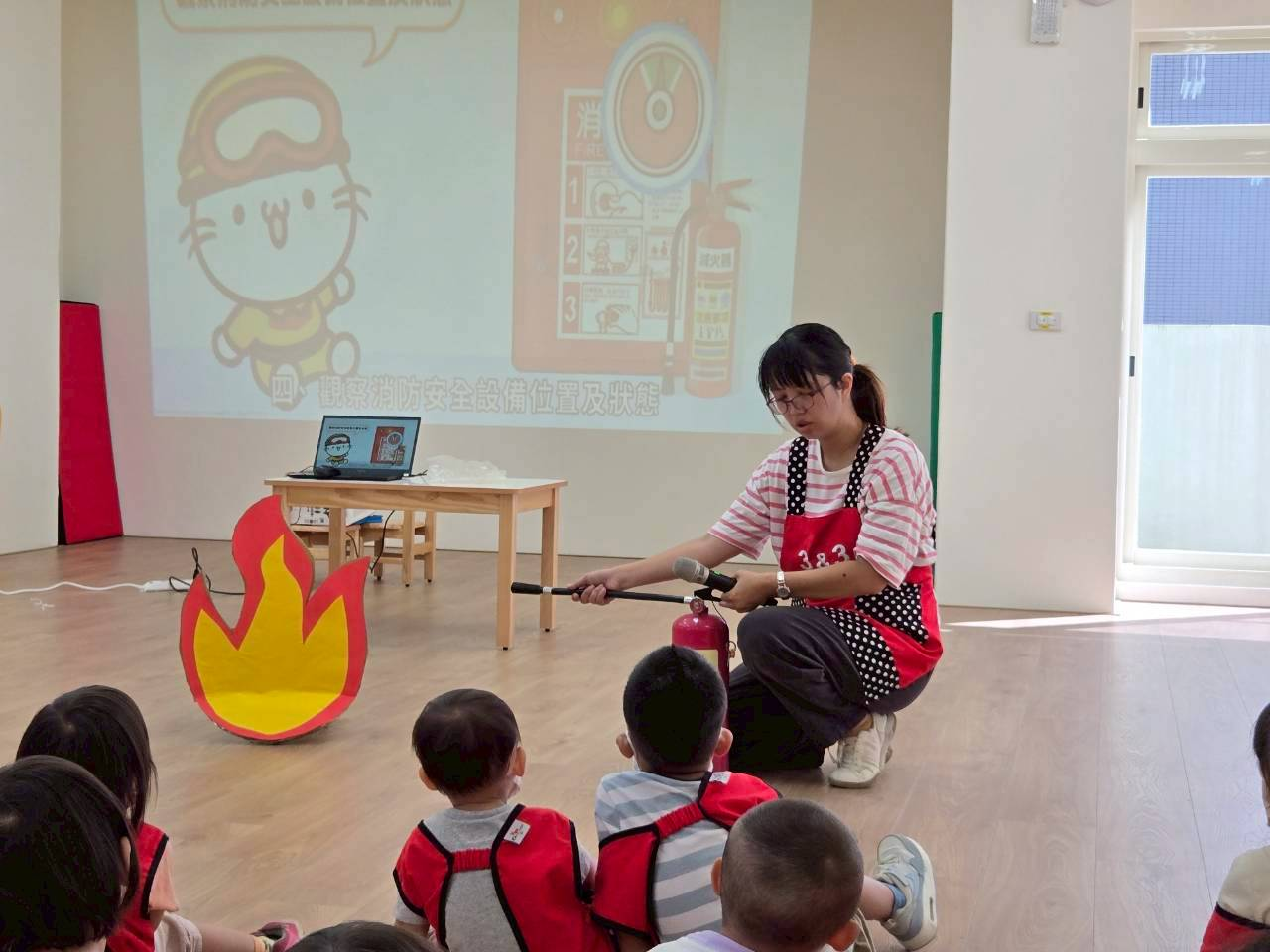 宣導滅火器的正確使用方式,以及火災發生時的注意事項,並透過模擬廚房失火的情境,帶領幼兒進行消防逃生演練。