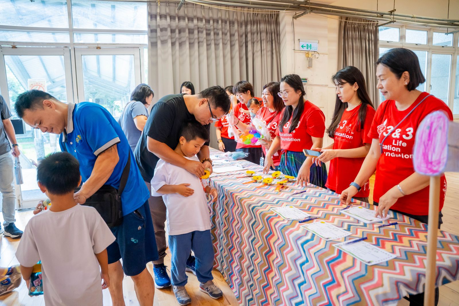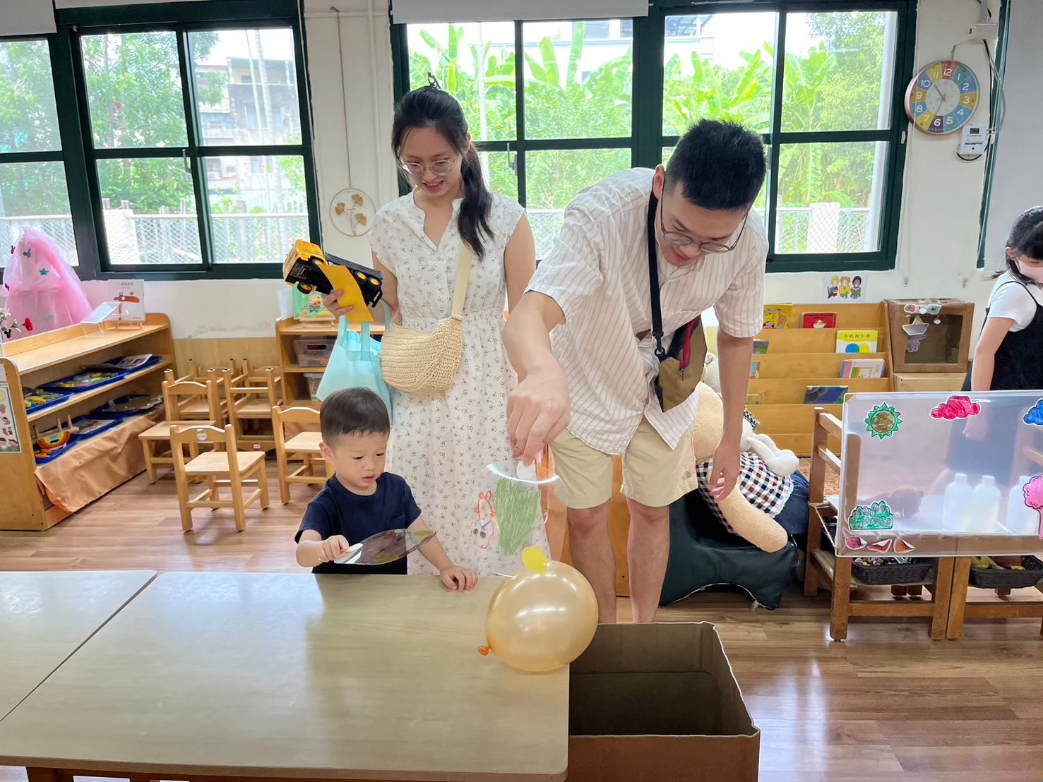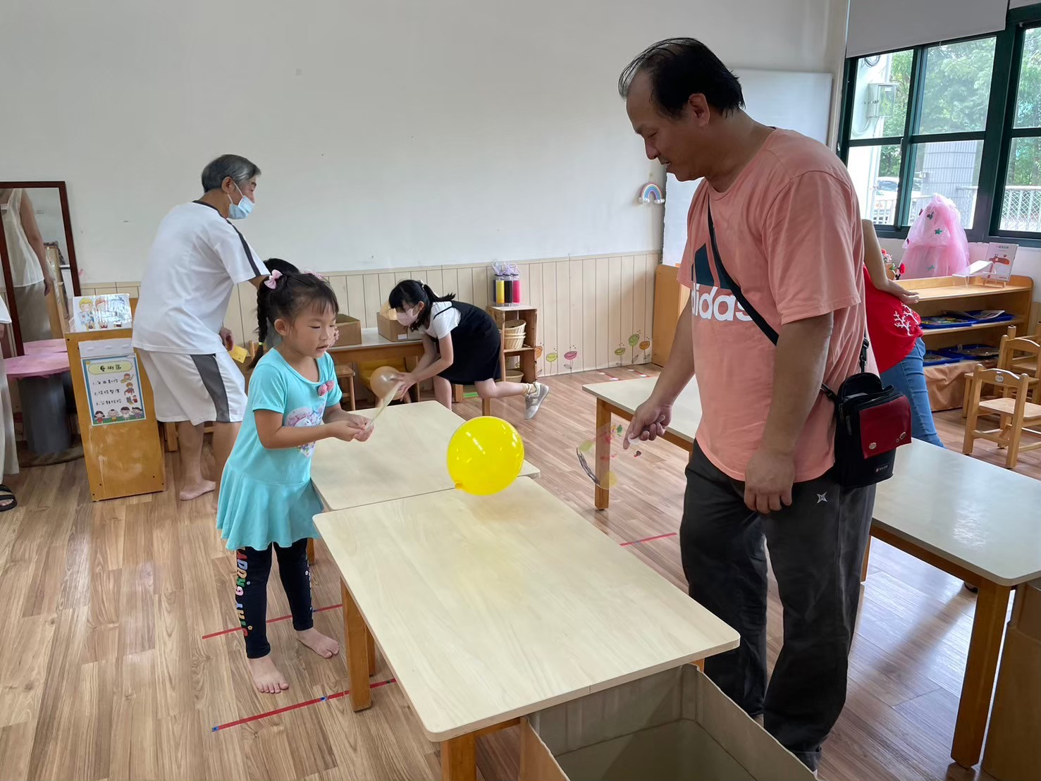 孩子與家人一起合力用扇子搧氣球,將氣球搧進紙箱中,即算完成。