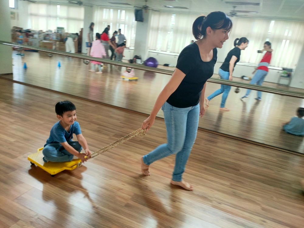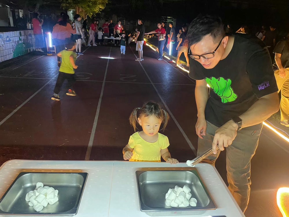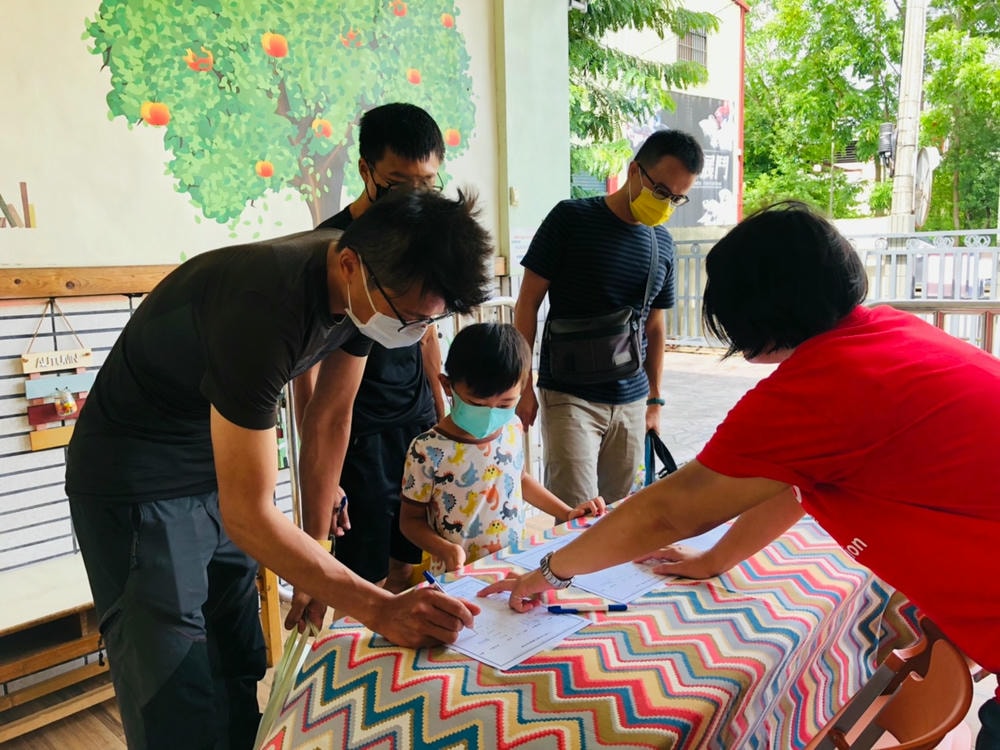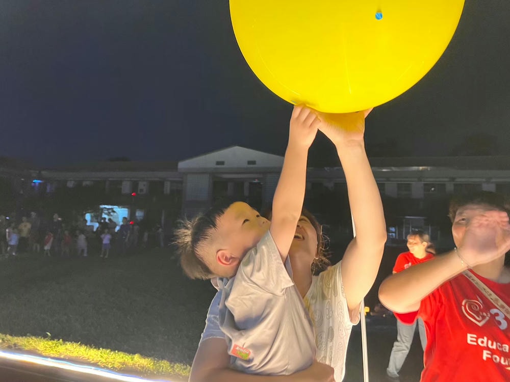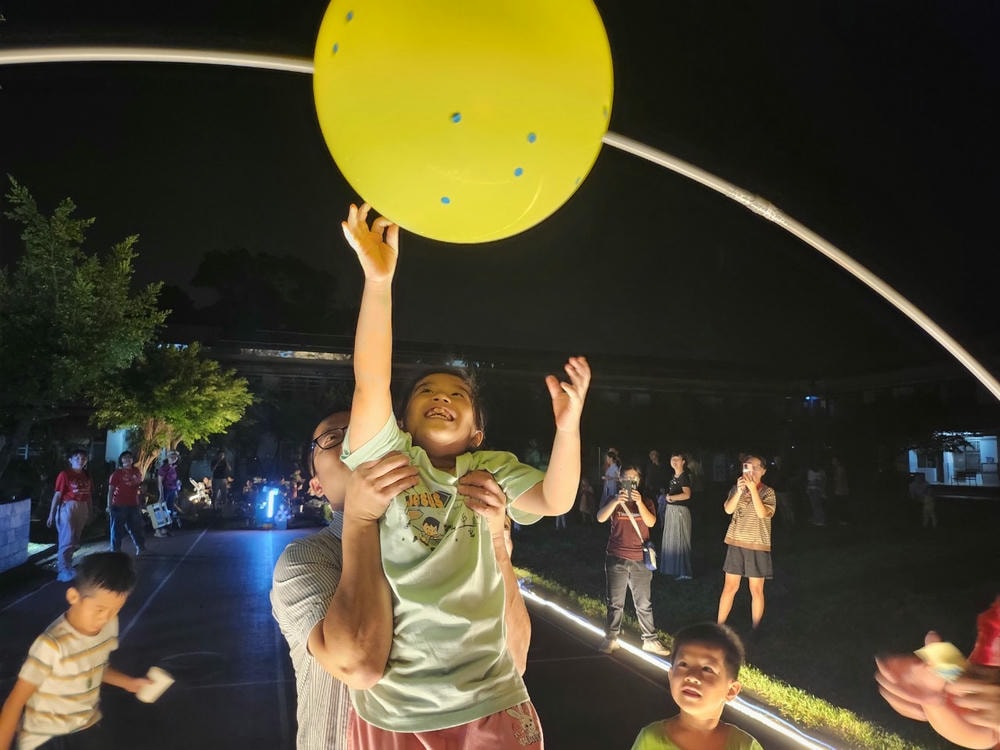 孩子與家人一起合力用扇子搧氣球,將氣球搧進紙箱中,即算完成。