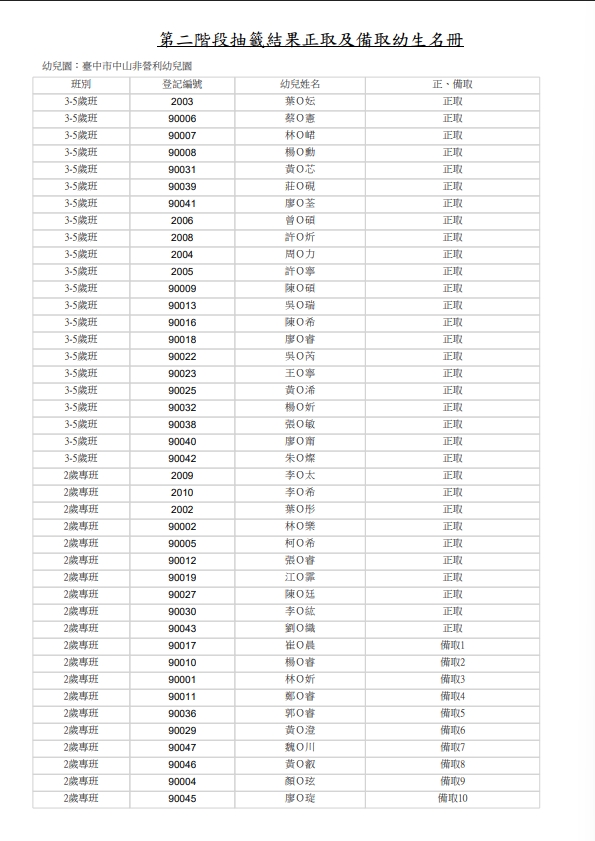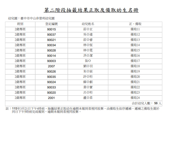 115學年度第二階段招生抽籤結果之正取與備取名冊