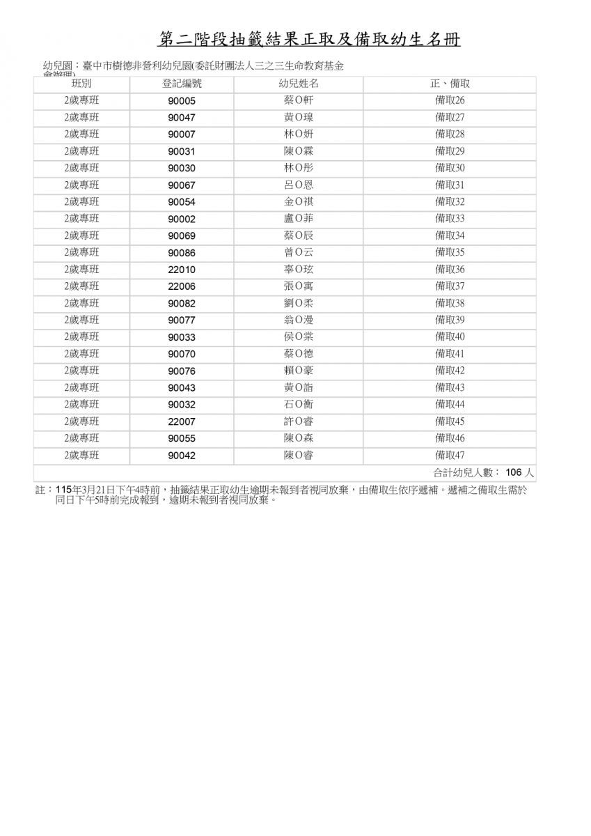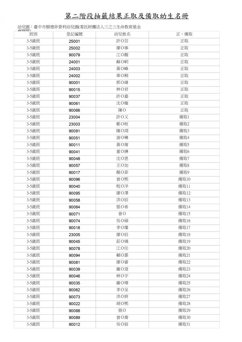 115學年度樹德 第二階段抽籤結果正取及備取幼生名單