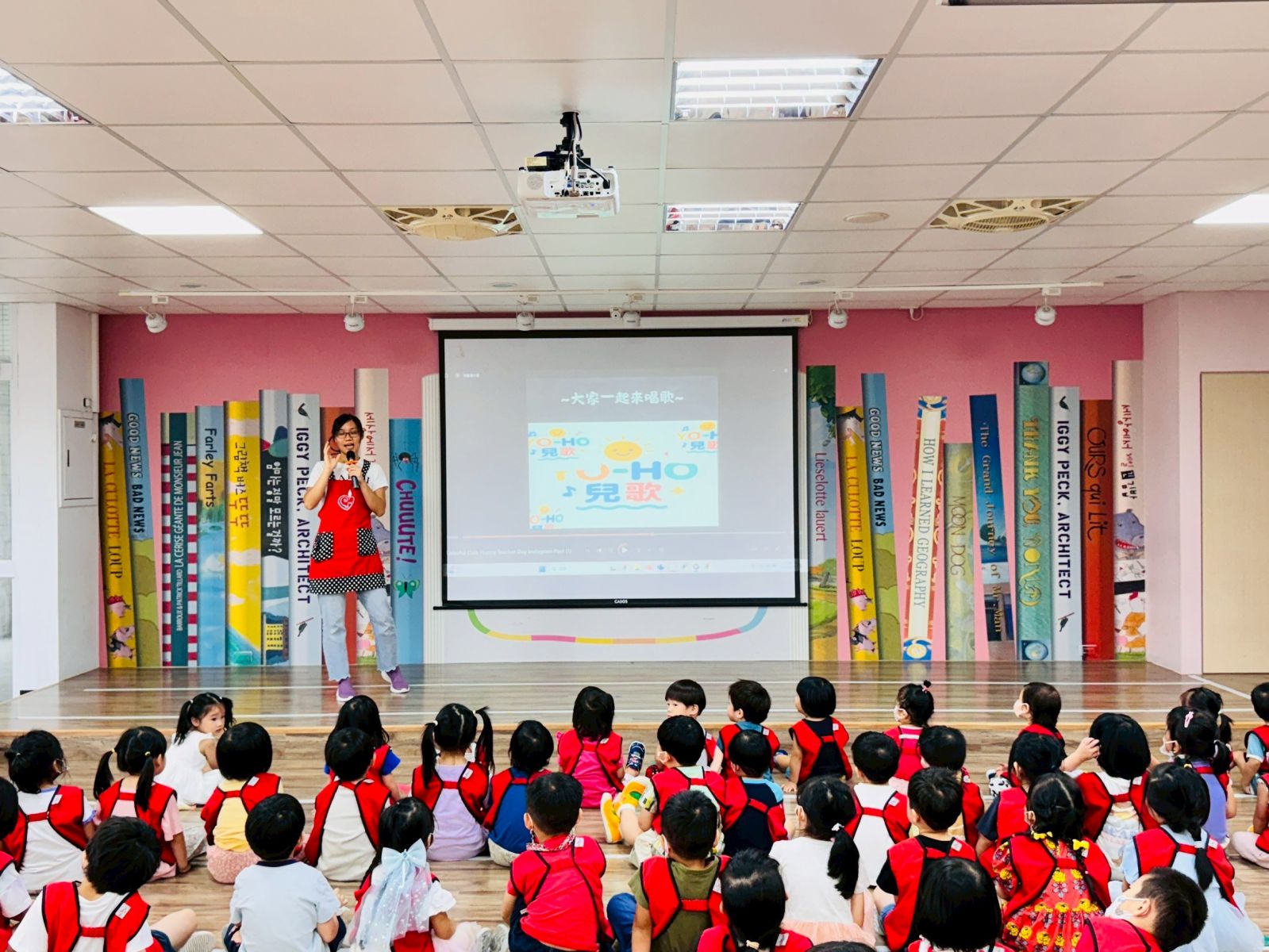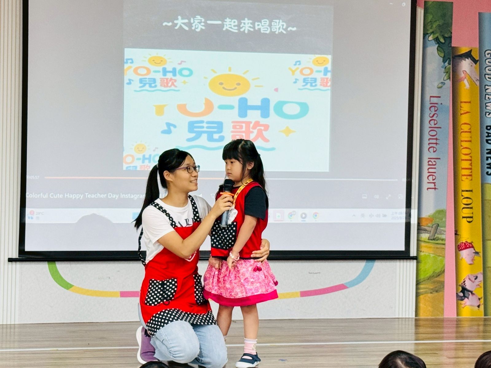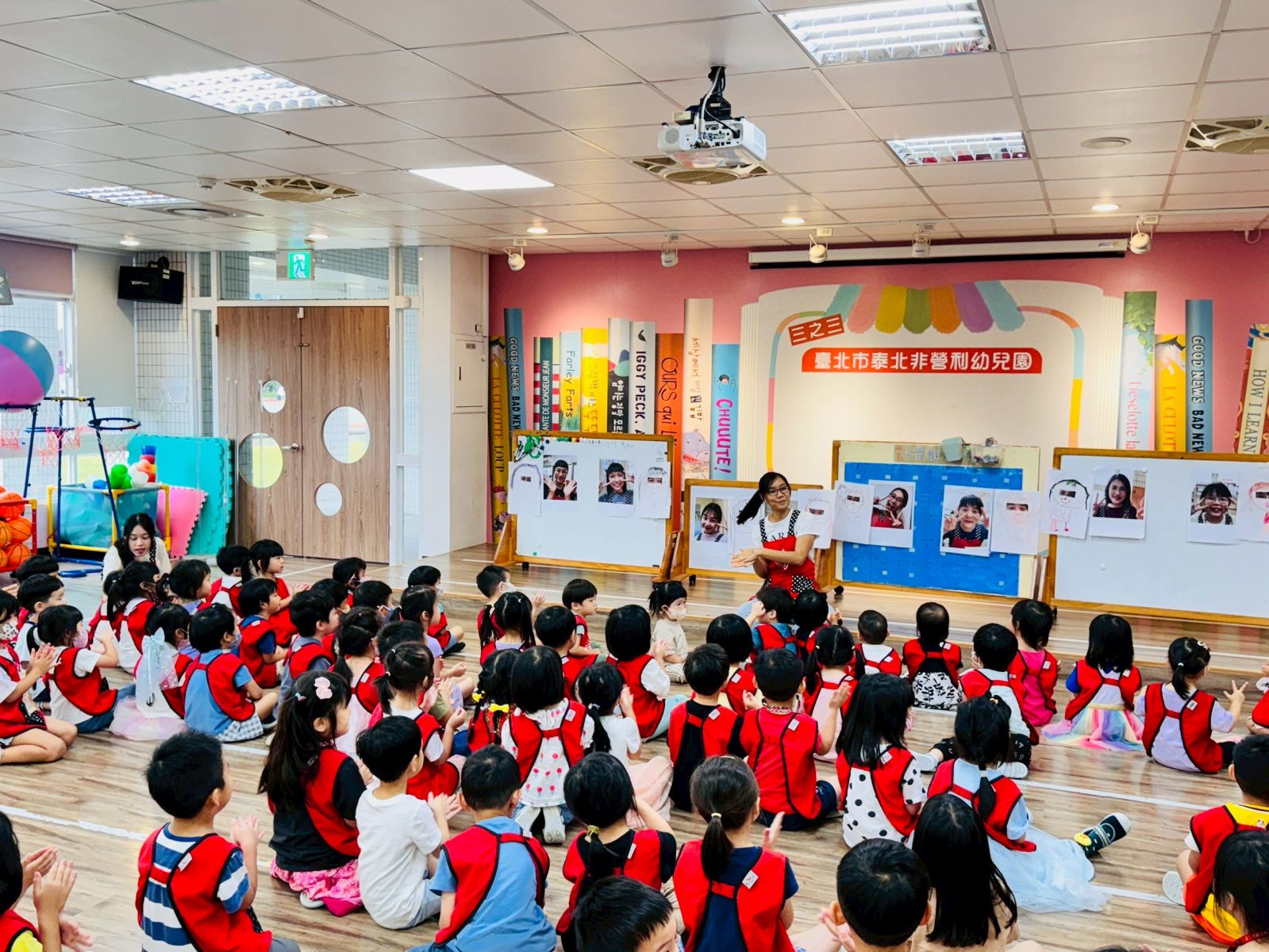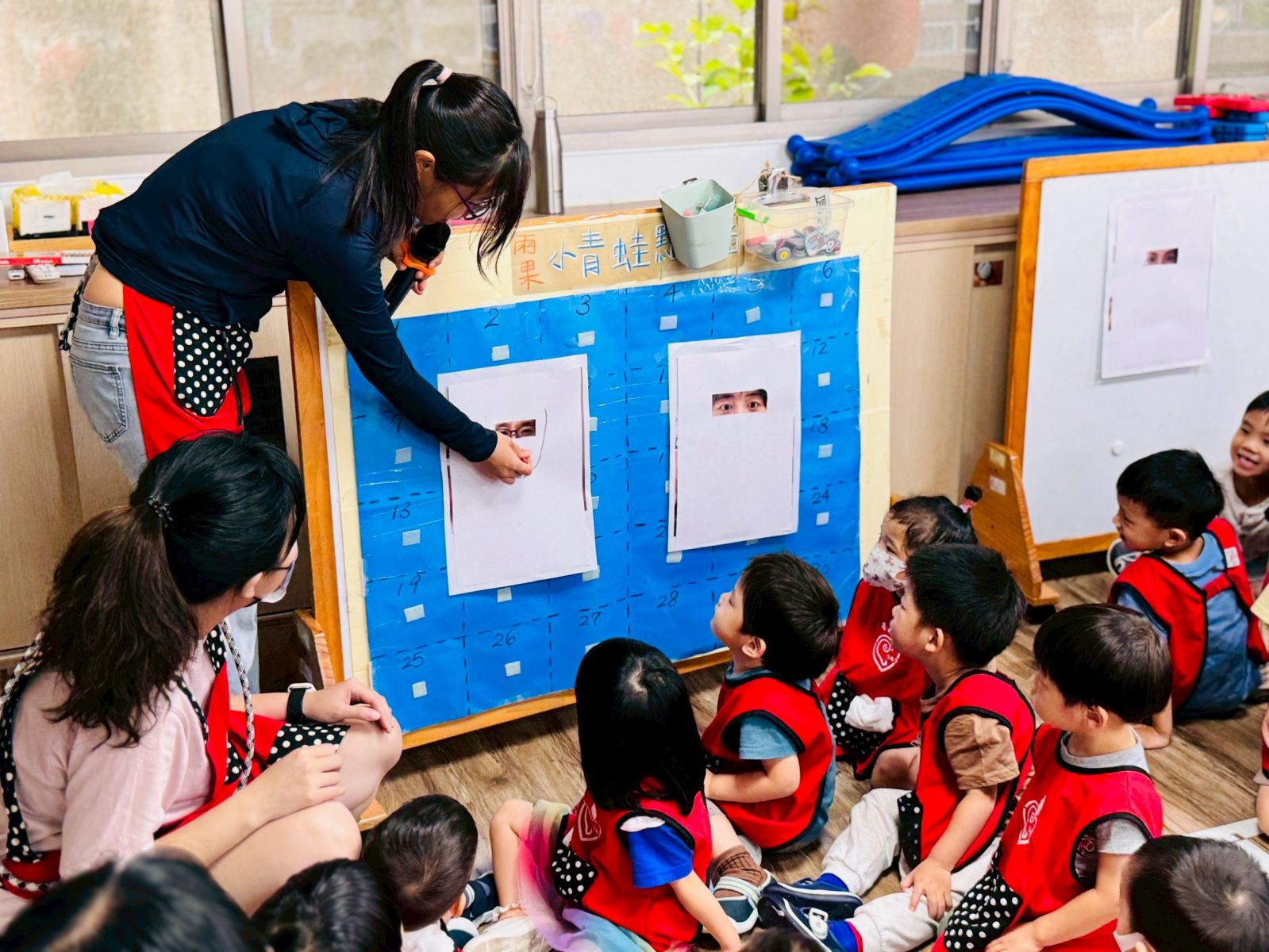 活動中透過影片與PPT,讓孩子們了解教師節的由來,也輪流上台分享對老師的愛與感謝。最有趣的環節是「猜猜老師的眼睛」,並自由創作老師的肖像畫,最後送上溫暖的擁抱,整場活動在歡笑與溫馨的氛圍中劃下句點。