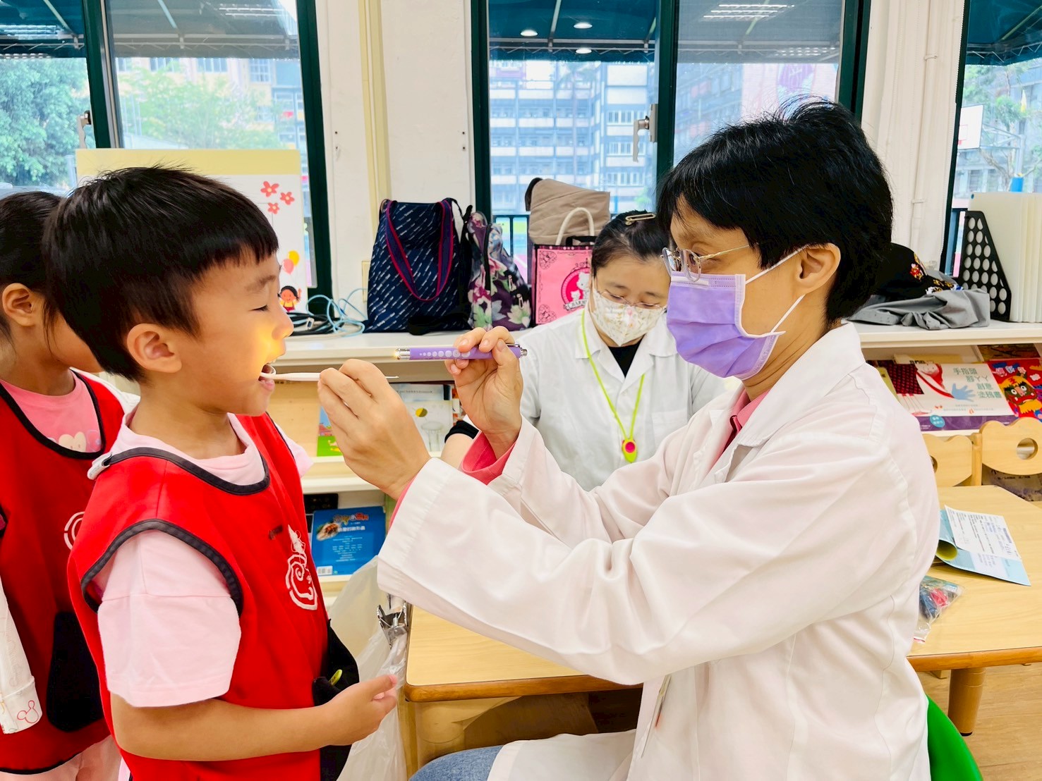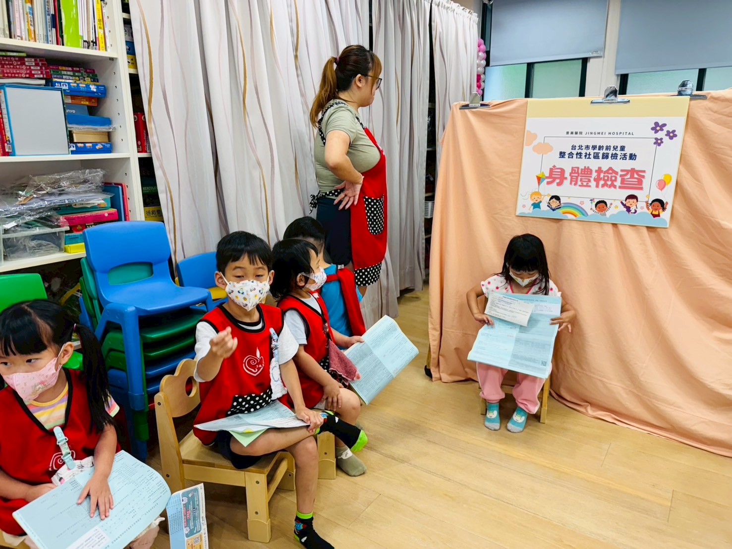 幼兒園每學年度配合政府政策,安排醫療院所的專業醫護人員進行整合性健康篩檢,內容包括身體檢查、口腔檢查、視力及聽力檢查,確保孩子們的健康狀況。透過早期發現與介入,幫助幼兒獲得適當的醫療或復健資源,促進其健康成長與發展。