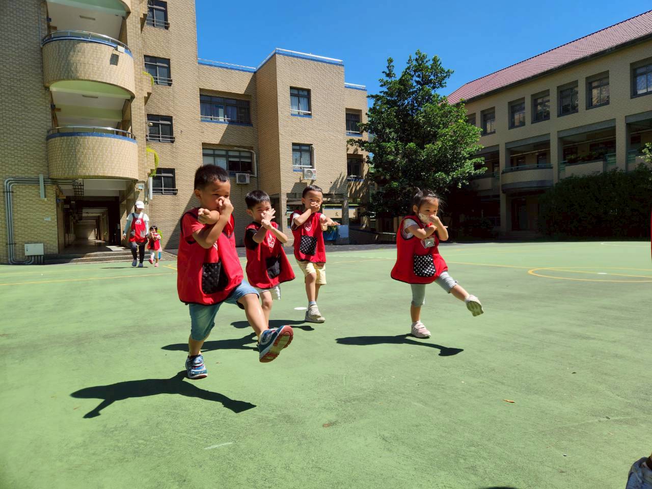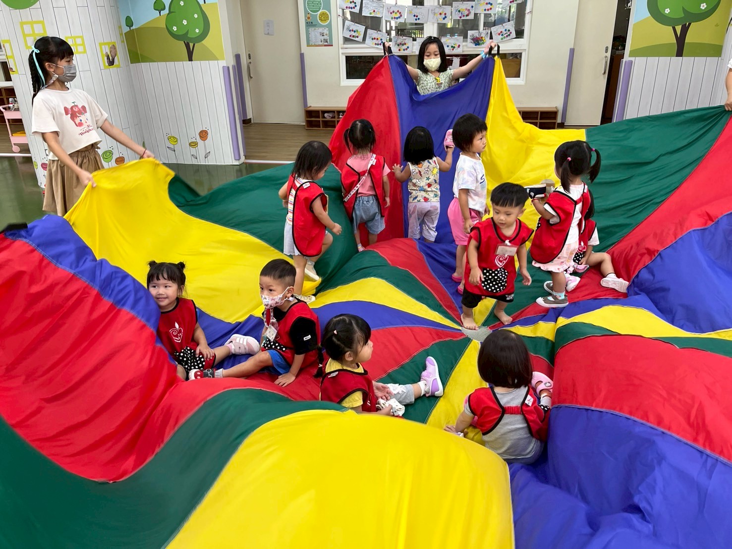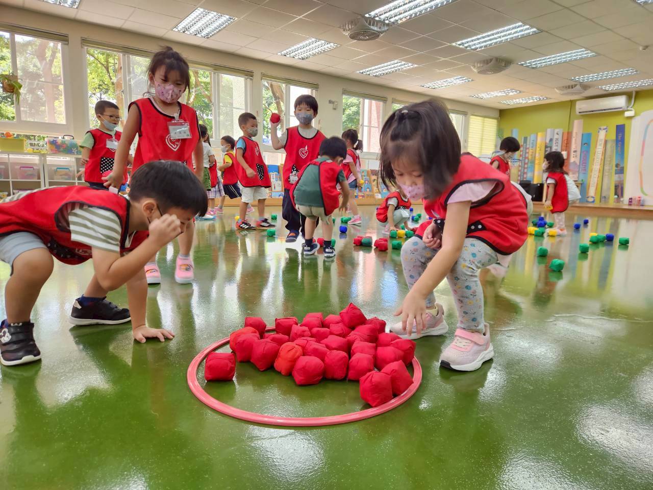 各班大肢體運動活動照片,老師每週運用不同器材,如跳繩、足球、籃球、氣球傘等各式器材,增加幼兒體能。