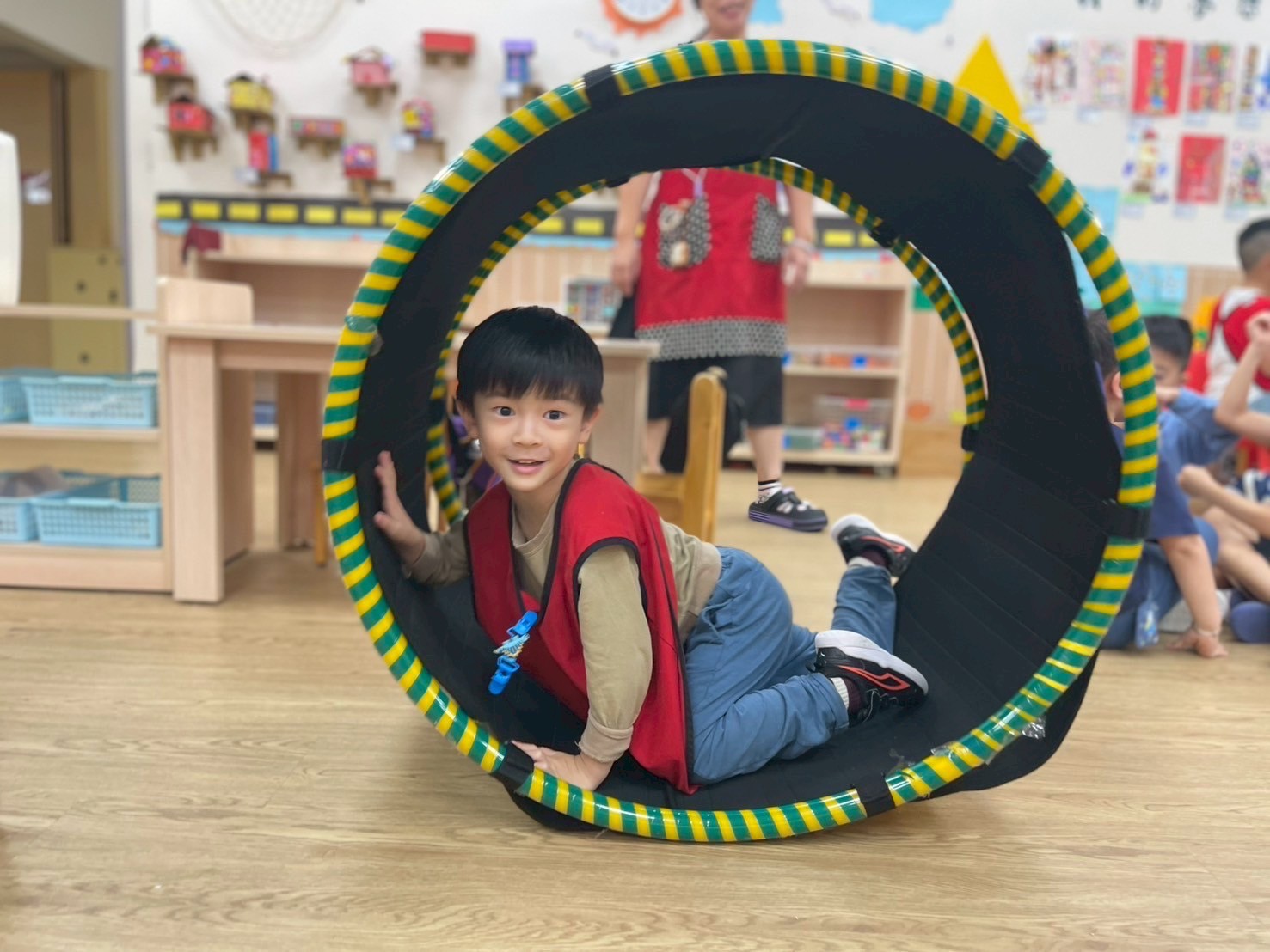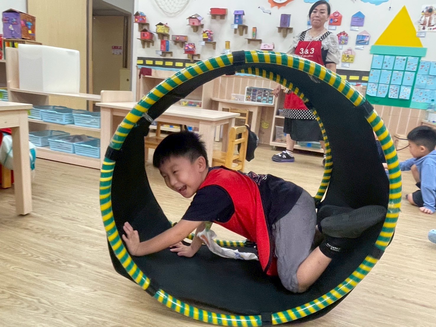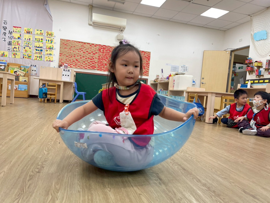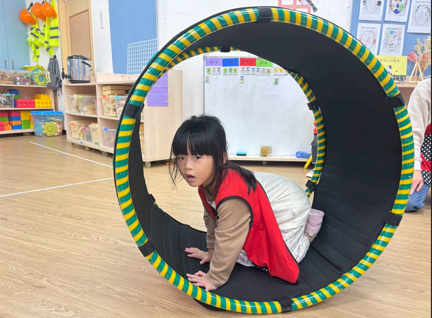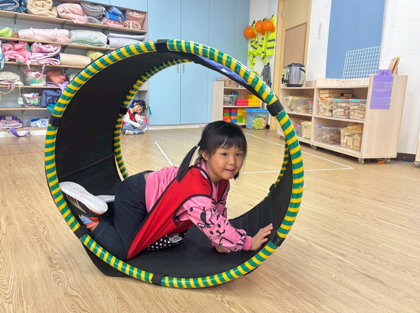 孩子在老師的陪伴下鑽進滾輪,滾動前進不只是有趣,更能訓練前庭覺、平衡感與大肌肉協調,透過遊戲培養孩子勇氣、與空間感。