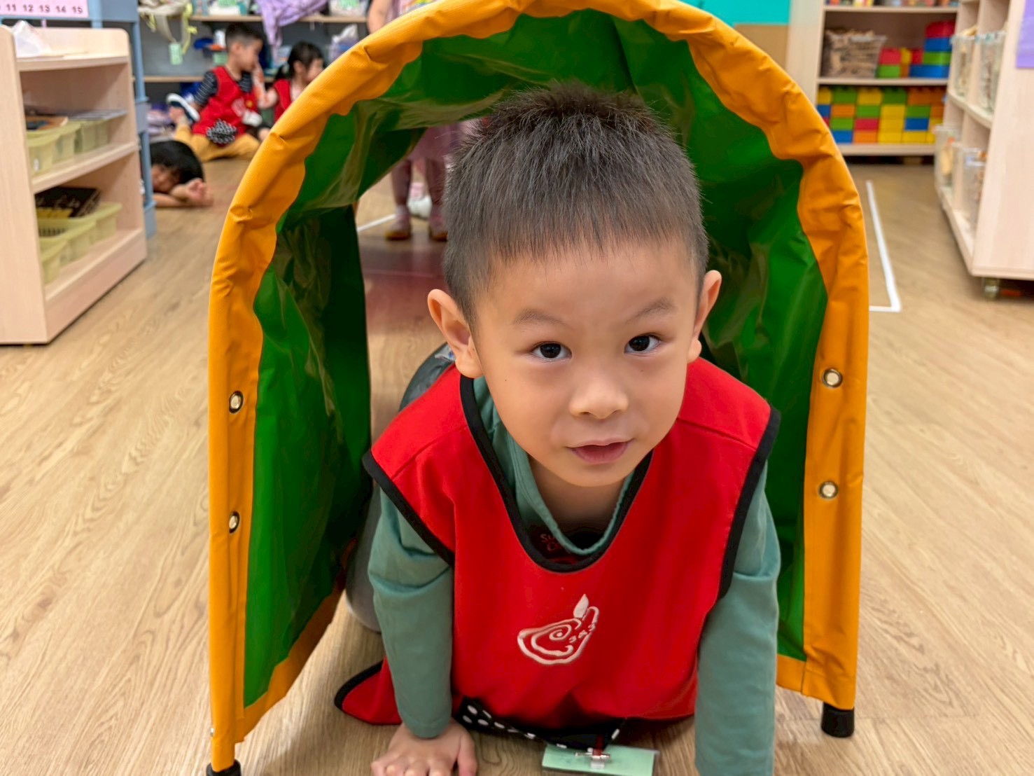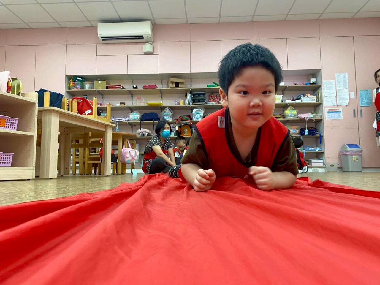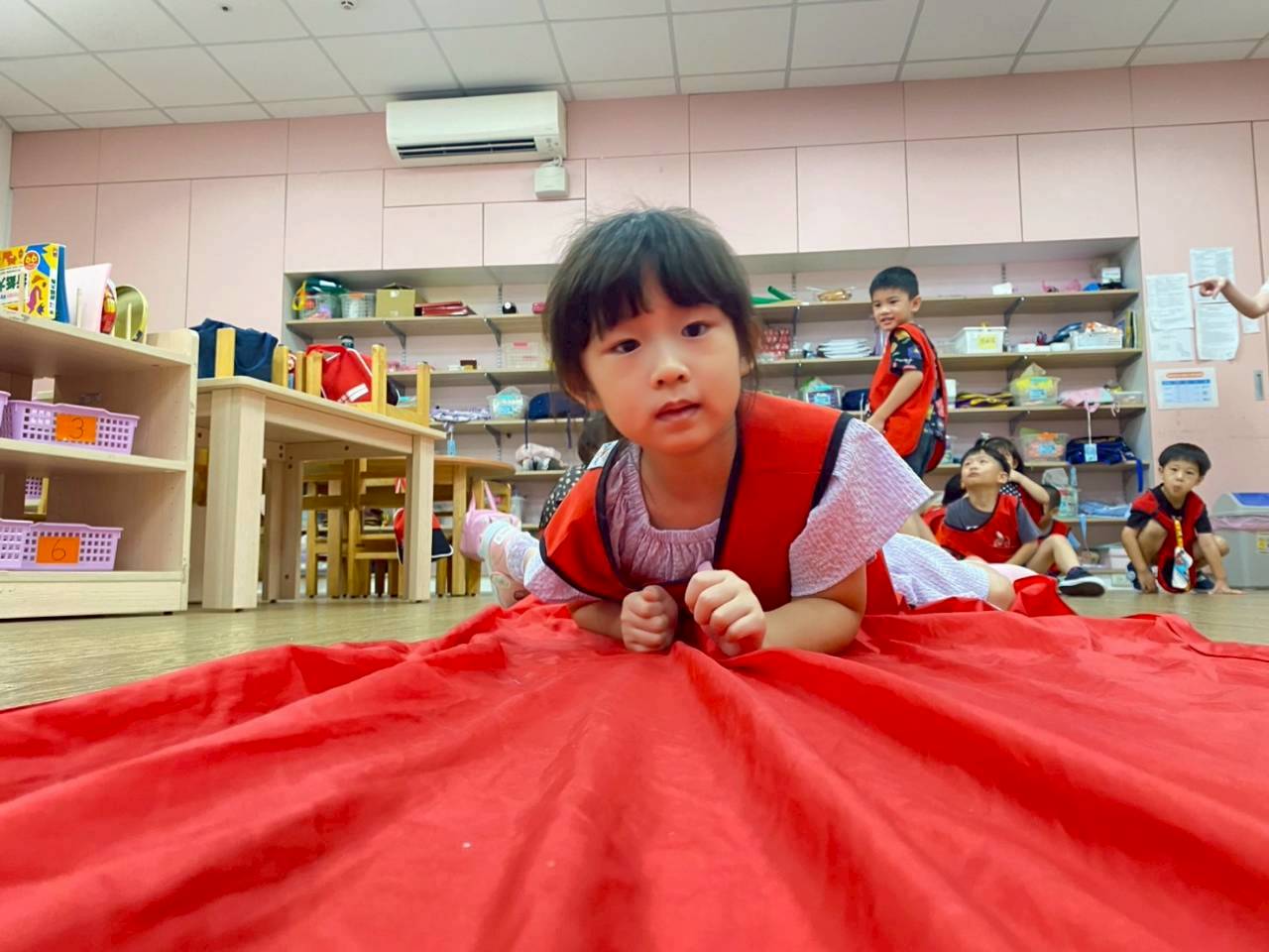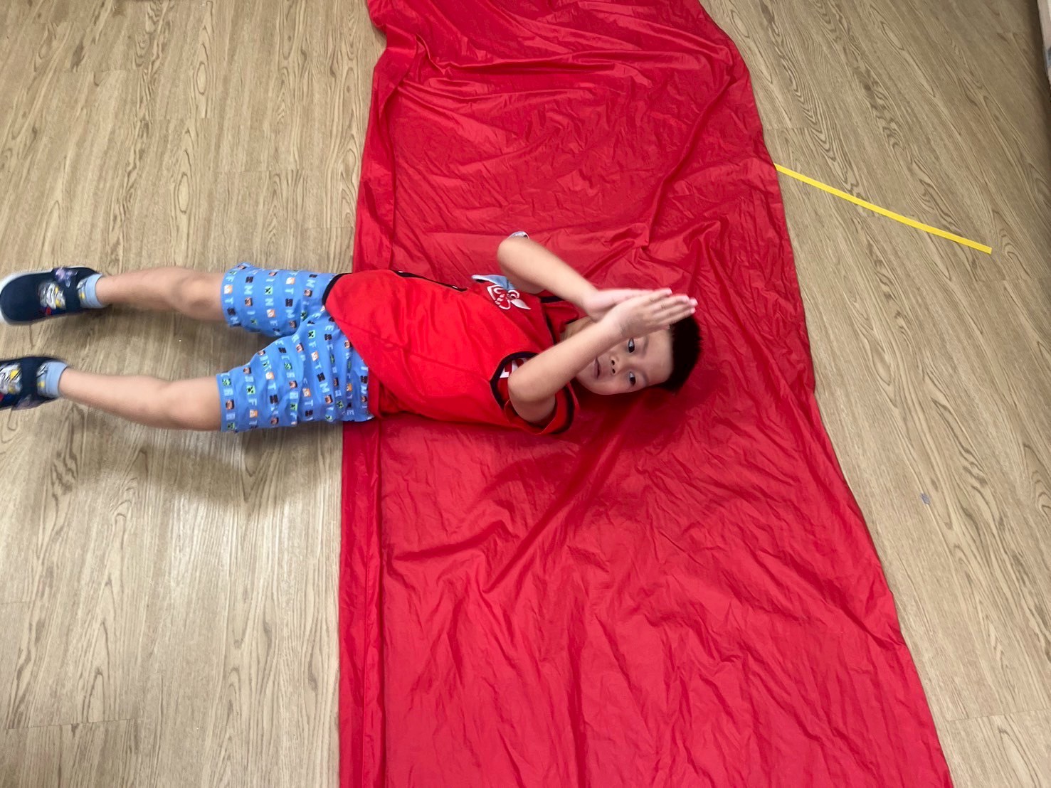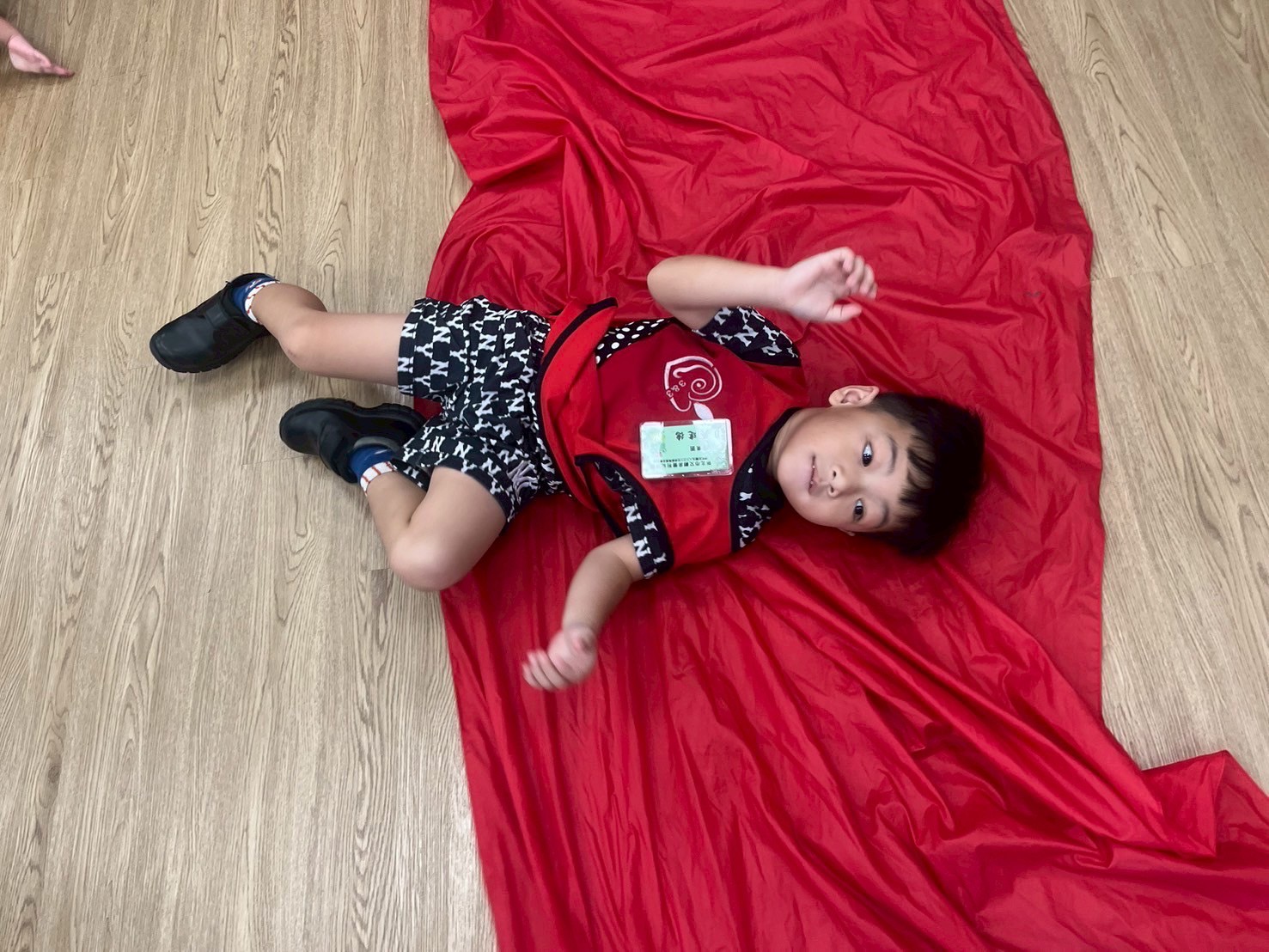 孩子們鑽進滑溜布中扮演小乳豬,在地面上快速蠕動、翻滾前進,歡笑聲此起彼落。這場「烤乳豬大賽」不只是好玩,更讓孩子在爬行與滾動中提升敏捷度,同時覺察身體在穩定與移動間的協調能力,強化動作控制與反應速度。